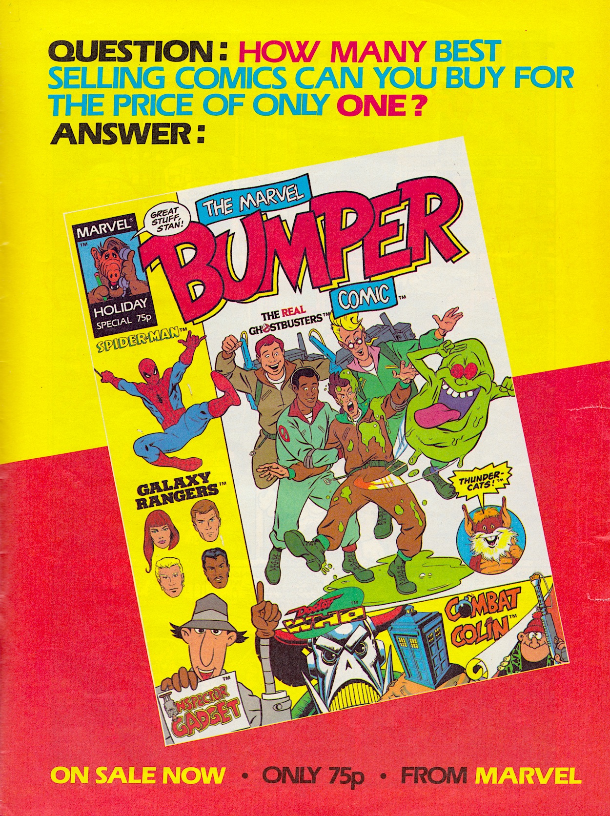 It’s also important to remember we’re talking about a comic starring sentient robots from outer space that can transform into various forms of human transport so sometimes it’s best not to take things too seriously. So, on to that advert and it’s one that brings back memories. Back in 1988 I read the comic advertised this week, the very first edition of The Marvel Bumper Comic. Fleetway had been enjoying great success with their Big Comic Books and had just released their new fortnightly comic version in mid-June. Repackaging reprints had the potential of great returns with little outgoings.