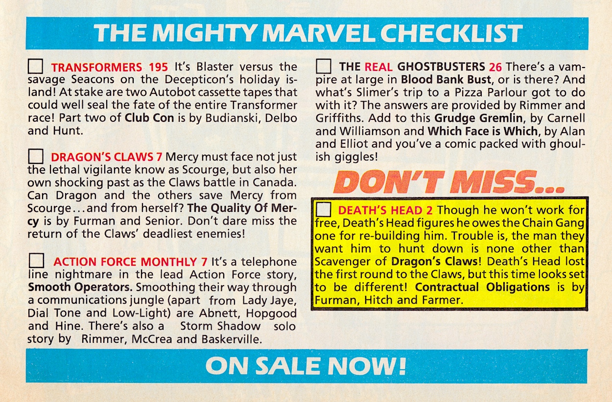 A reader also asks is he’s too old to read Transformers, Action Force, Death’s Head and Dragon’s Claws. Little could that 18-year-old have known how these comics would remain treasured for decades. The Real Ghostbusters’ readers are asked to help them save the world with a toy product recall (too much lead in a Ghost Pen Light) and Spengler’s Spirit Guide details lesser known vampires such as Dracula’s gullible brother who was killed with Perrier. How could Marvel top that? Let’s check the checklist.