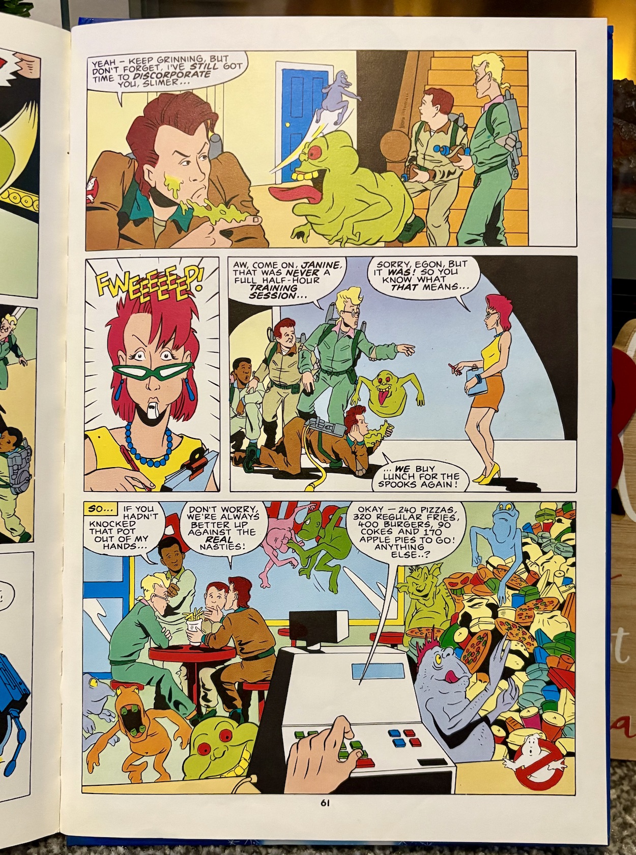 Sure enough, it’s just a training exercise. Needing to keep themselves in fine form Slimer has recruited a bunch of his good ghost pals, with payment being everything they can eat at a local diner if they win. Given how they’re all good friends with Slimer (and we know what his appetite is like) this is a particularly funny ending to not only this short strip but the book as a whole.