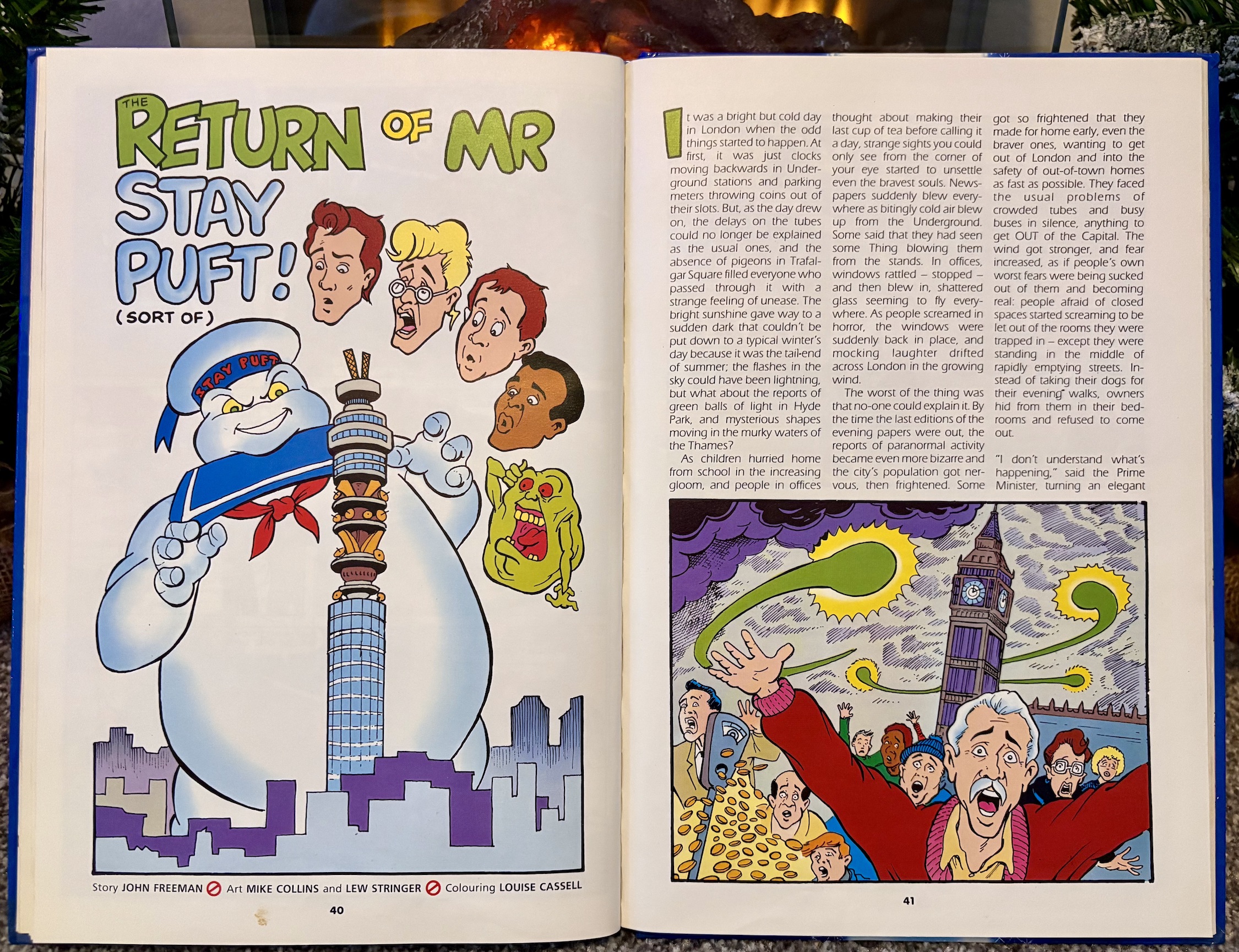 The best story of the whole book is written by friend of the blog John Freeman (editor of Doctor Who Magazine, Babylon 5 Magazine, Star Trek Magazine), who brings back the iconic Stay Puft Marshmallow Man for a story set in London. The art is pencilled by Mike Collins (Transformers, Doctor Who, Tharg’s Future Shocks) and inked by OiNK’s very own Lew Stringer (Tom Thug, Combat Colin, Sonic the Comic). Lew and Mike are good friends and started in the business around the same time but this remains the only time they’ve ever worked together on the same story.