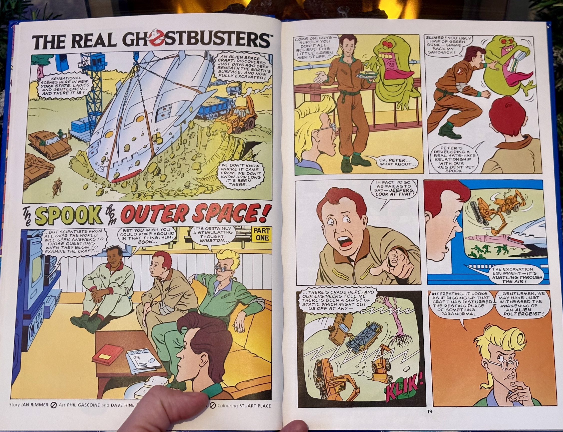 In the end we find out the alien has been psychically moving all of the heavy machinery in order to spell out a message on the ground that it just wants to be sent home, so the Ghostbusters commandeer one of the army’s rockets, trap the alien (with their permission) and fire it off into space. It’s a fun tale that includes a good bit of witty banter between the four men and would end up being one of a few strips from this annual we’d “get another chance to read” in the weekly a couple of years later.