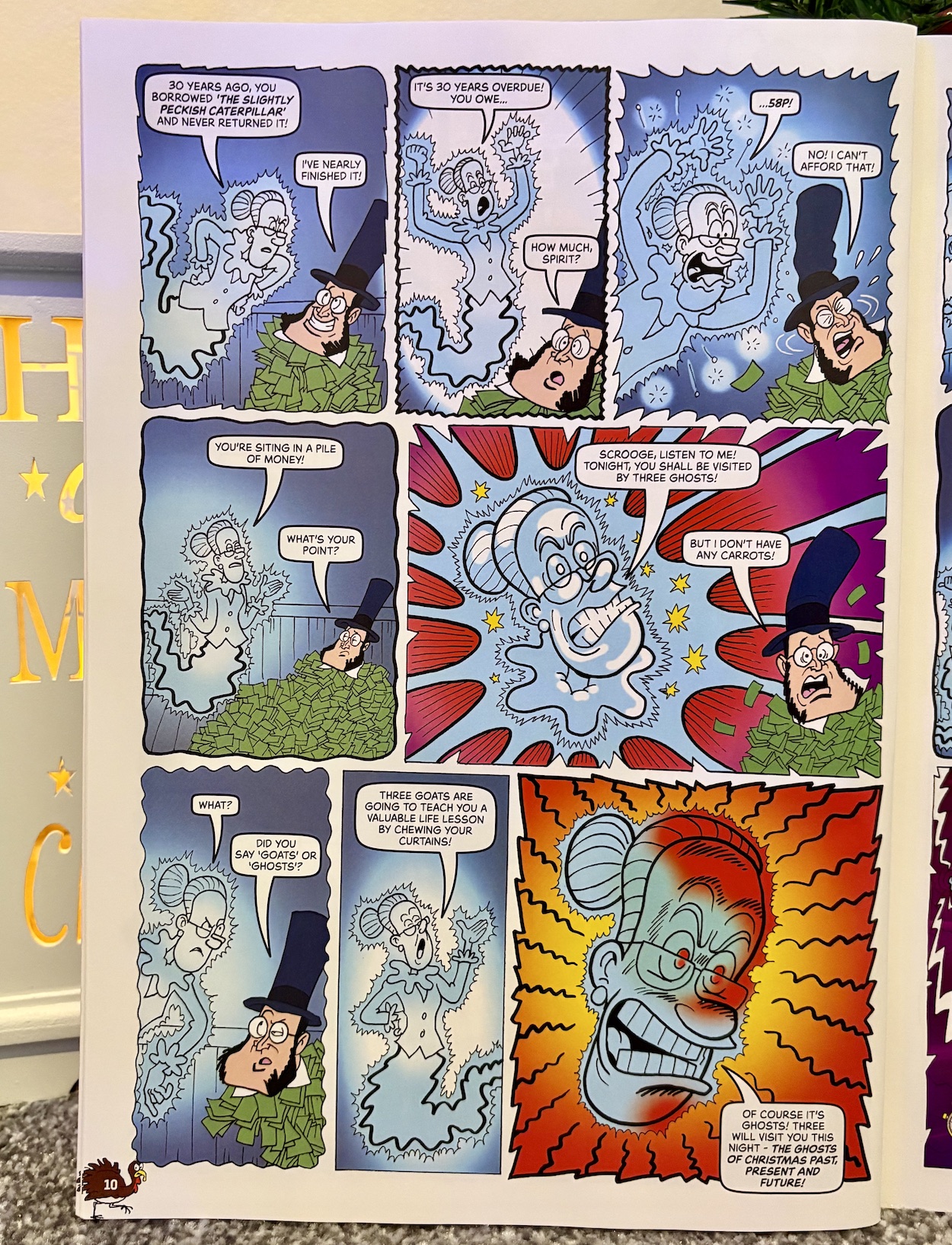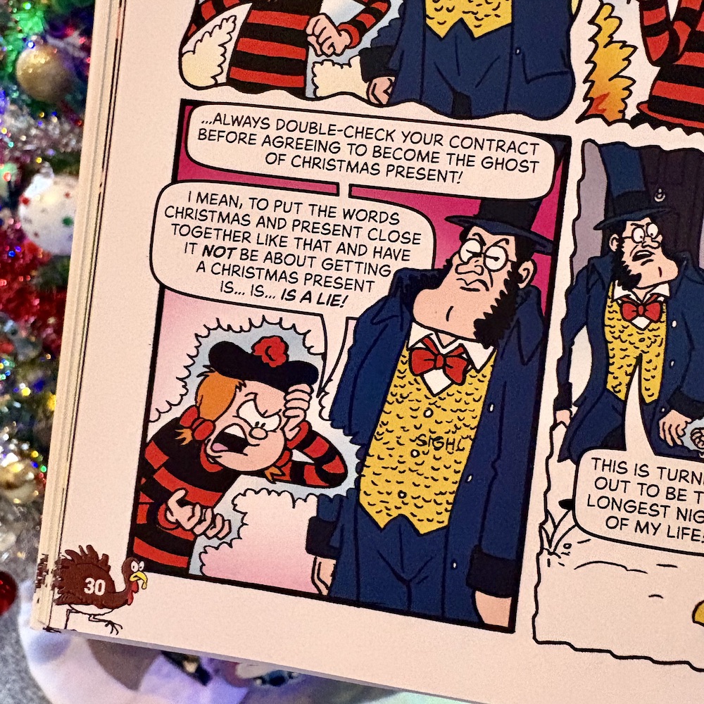 Just like last year, the special is one long story told over various strips starring a collection of the comic’s fan favourites. Dennis, for example, is not only Dennis Scratchit in his retelling but also the first of the ghosts. He’s the narrator and in charge, and it’s Dennis, so of course he’d do this and it’s hilariously brushed aside in the story. Although for me the real star of the piece isn’t Dennis or even Mayor Brown as Scrooge, it has to be Rubi.