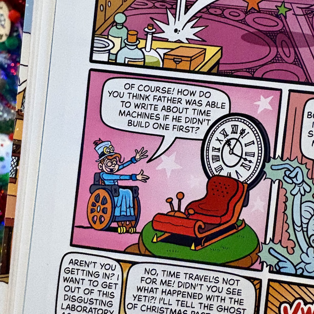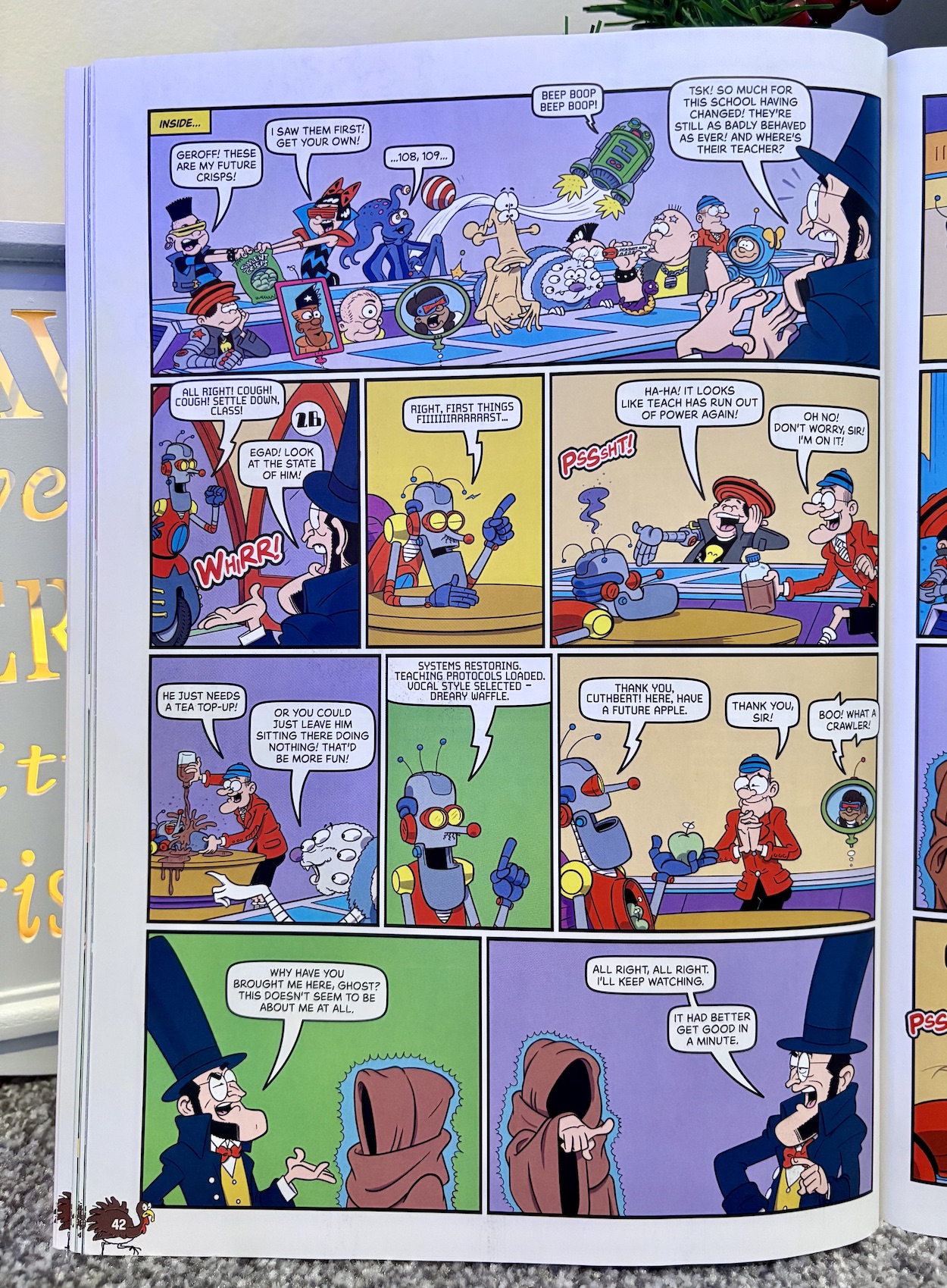 Rubi’s Screwtop Science pops up several times across the issue thanks to her dad’s time machine invention. Oh, and her dad is H.G. Wells so you can guess what the machine looks like (and it comes complete with a certain Doctor Who sound effect). You see, the ghosts are all a bit useless and need Rubi’s help in order to carry out their plan to make Scrooge learn the error of his ways and the true meaning of Christmas. But this is the modern day Beano and it all goes completely nuts and utterly chaotic very quickly!