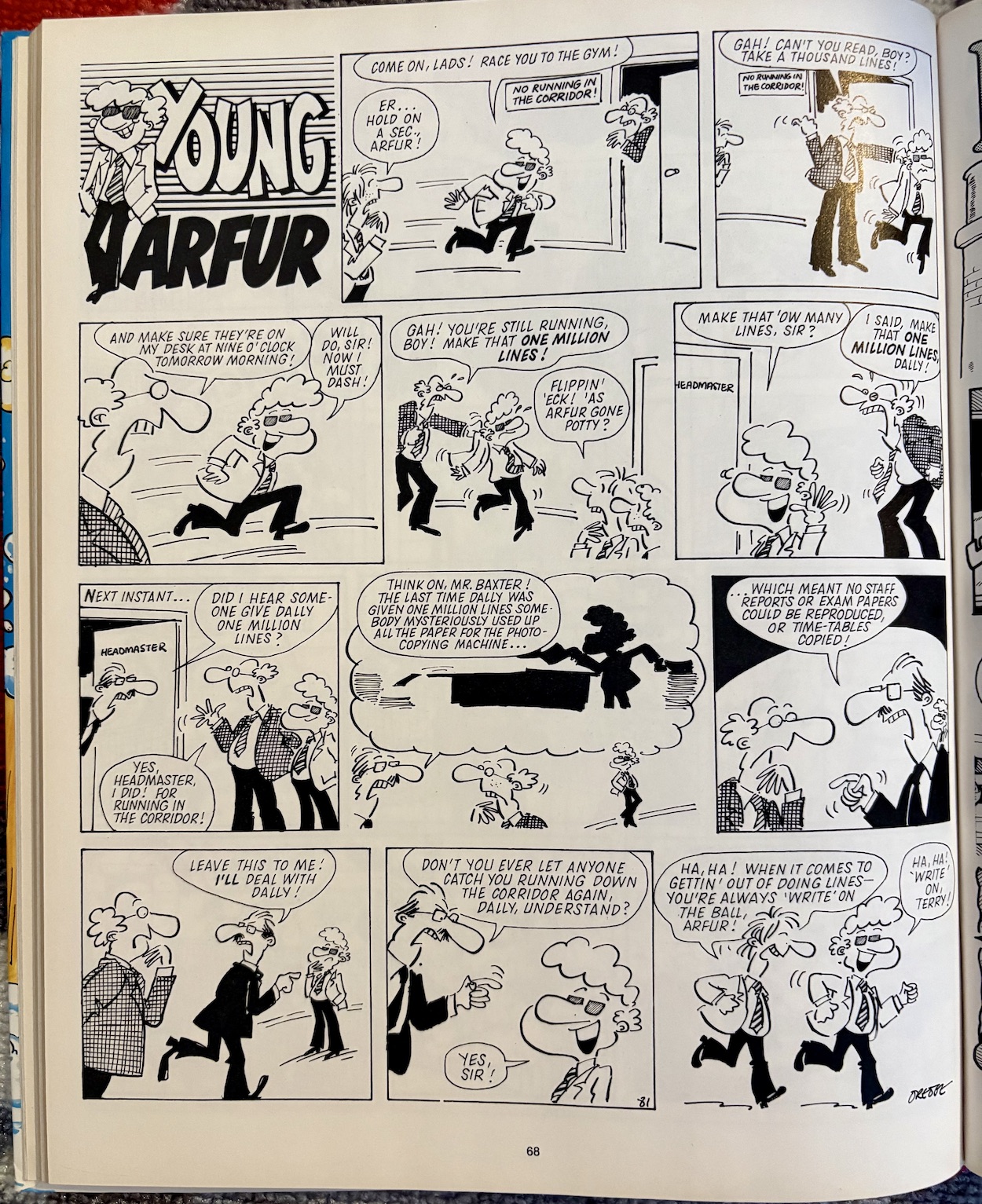 Young Arfur is back and seeing as he’s drawn by fellow OiNK cartoonist Pete Dredge I had to include him again. UPDATE: Not only that but OiNK co-editor Patrick Gallagher helpfully left a comment (below) on this post to let us know he wrote it! It was a hard choice between his strips but this one just pips the others with its neat twist on the usual formula; instead of talking his way out of something he gets his teacher to do it for him. Arfur disappeared from the pages of Buster in 1987 so either he continued with new yearly strips for fans or this could be another reprint. My money is on the former because he has pride of place on the higher quality pages in the book.