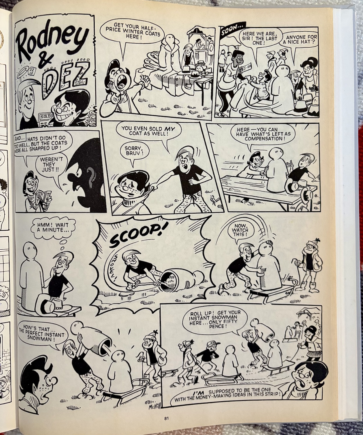 He’s a lovable rogue, a phrase which could be used to describe certain brothers in a BBC sitcom that starred David Jason and Nicholas Lyndhurst, characters that were definitely not inspiration for the next strip. Nope, not at all. Actually, I think the word “inspiration” is being rather kind and that’s why it stood out. A Buster original drawn by Gordon Hill, Rodney and Dez lasted only one year in the comic around the time of this annual’s release.