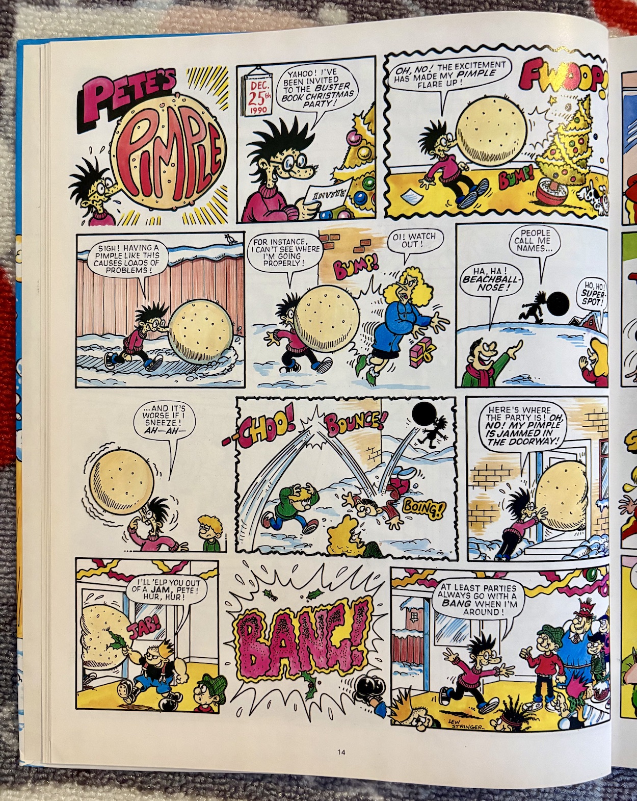 It still feels like several issues bound together but at least more of them have been printed on better paper. Our first OiNK star (of which we’re now down to two) is Lew Stringer’s Pete Throb in the shorter-titled Pete’s Pimple. Pete had already said goodbye to regular Buster readers by the time this annual was released so it’s strange to see it’s more of an introductory strip than anything. In fact some elements are very similar to his first Buster strip.