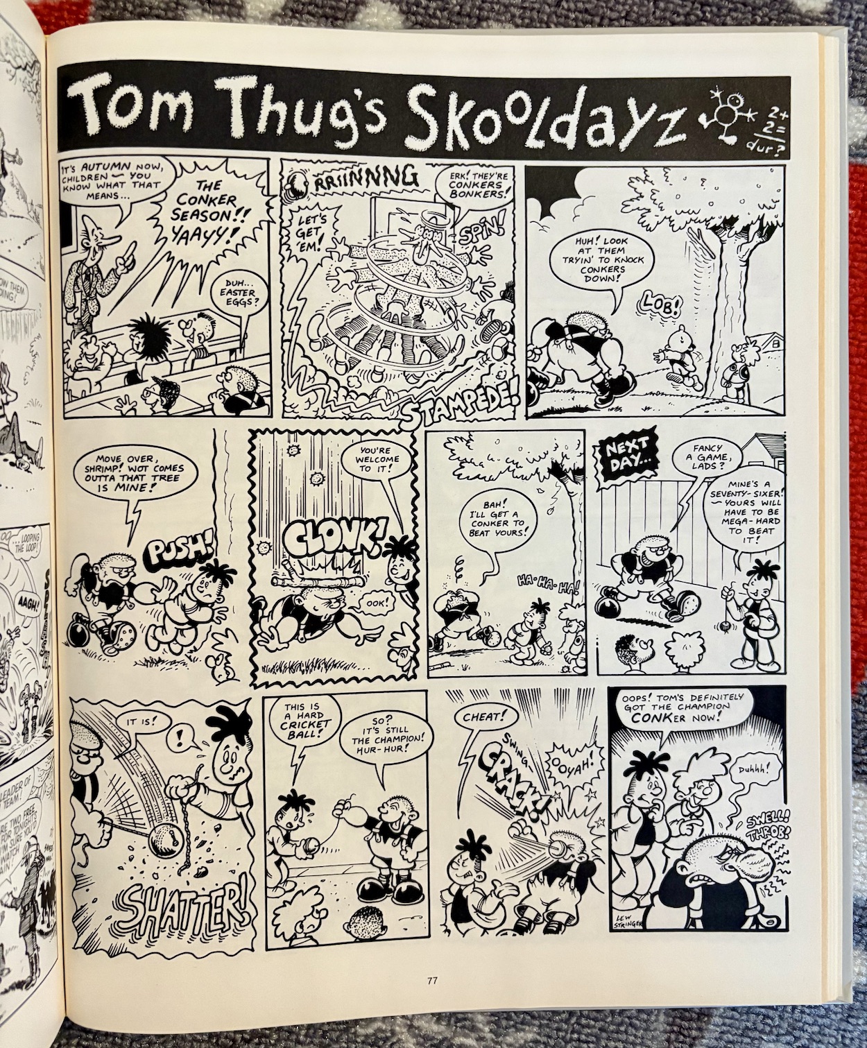 Did you ever play conkers as a child? I could never get on with it. For someone who loves their videogames today I must’ve had rubbish hand-eye coordination back then and I could never hit anything… apart from the occasional friend’s hand. Kids in comics always seemed crazy for them and those in Tom’s class were no exception. Maybe if this had been an OiNK strip we’d have seen Tom inflict the cricket ball on himself after trying to harm someone else, but the strip still raises a smile.