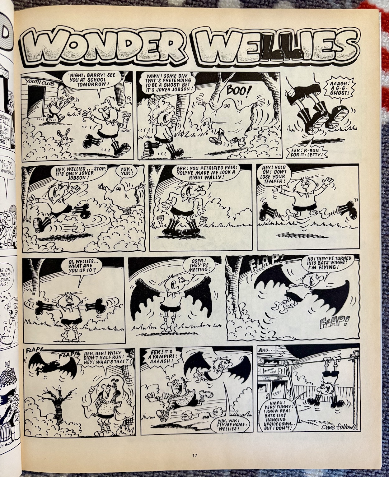 Next up is another character who (much like Gums) continued on in the pages of the Buster Books long after they’d disappeared from the weekly. Despite winning a Cartoonist Club of Great Britain award, Wonder Wellies only lasted two years in the long-running comic, ending in 1985. According to Lew and John Freeman, these Fleetway annuals could sometimes use reprints to fill out their pages so there’s always the possibility that’s the case here but I can’t confirm. Written by Roy Davis this stood out to me because it was drawn by OiNK cartoonist Dave Follows.