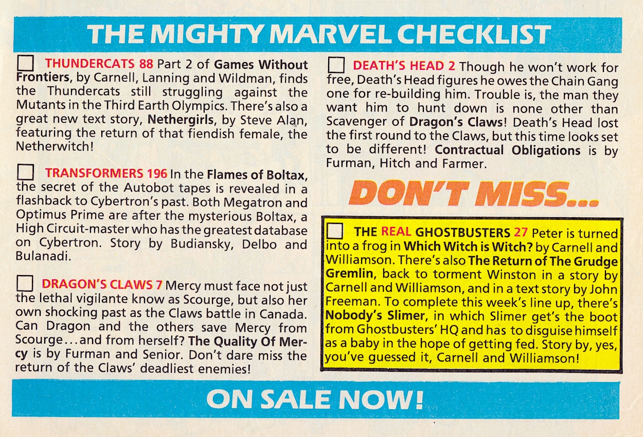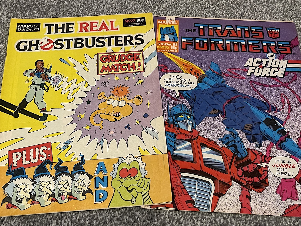 Bambos Georgiou brought us his first full cover for this week’s The Real Ghostbusters. He’d taken over from Lew Stringer on the Blimey! It’s Slimer strip but I’d forgotten all about his other contributions to the comic. Across the way Art Wetherell and Stephen Baskerville brought us the latest Transformers and Action Force cover with the trademark Marvel UK stippled background they used so much across their range at the time.