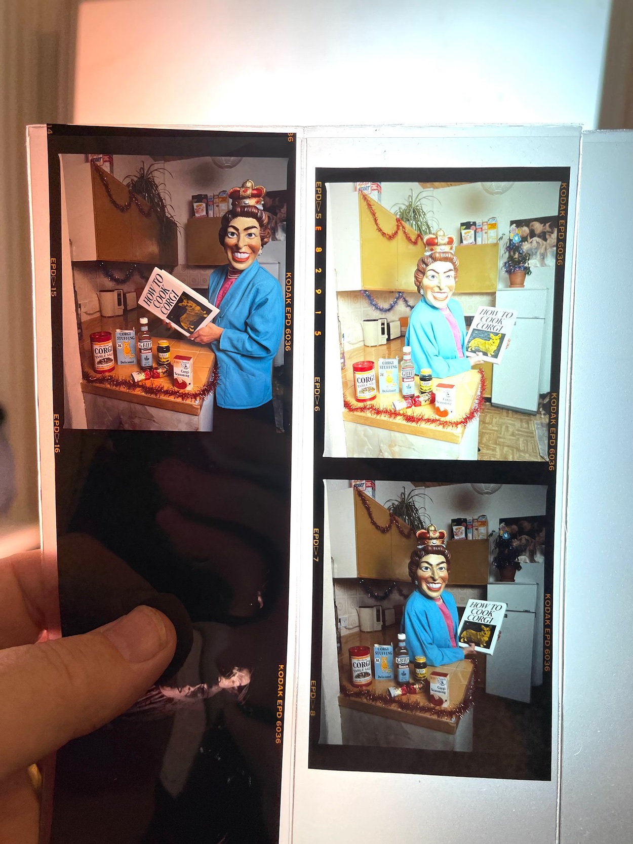 Fittingly for the timing of this post Ian also photographed the funny cover to the comic’s first Christmas issue and its iconic imagery of the Queen preparing to cook up a corgi. Ian has kindly shared some of the transparencies with me of the various poses that ultimately weren’t used. These were all taken in Ian’s own kitchen and behind the royal mask was his own personal friend, Sally.