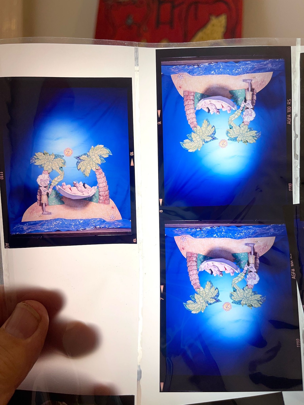 Also above you can see a model that we know was definitely created by Ian Jackson, the one used for the first Holiday Special of a plasticine Uncle Pigg being fanned by a cardboard Mary Lighthouse (critic) on a tropical desert isle. You can clearly see the blue drape used as the background and the simple crumpled up material posing as the sea. It’s fascinating seeing how such an iconic cover was originally created using such cheap but ultimately creative methods. These photos were taken in December the year before the special’s release.