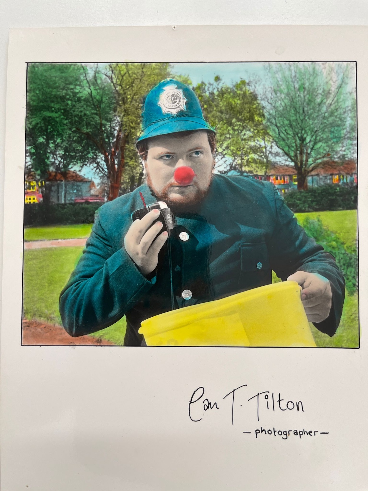 Sally wasn’t the only one of Ian’s friends to appear in OiNK. In fact, they were all enthusiastic to appear and that included Ian’s housemate, Alan Shaw. He appeared as PC Porker in Swindler Sid’s Great Lolly Folly in #7. The photo has been hand-coloured after the fact, although the strip was printed in black and white. Another of the photo stories Ian captured was printed in colour though, and luckily he still has the original.