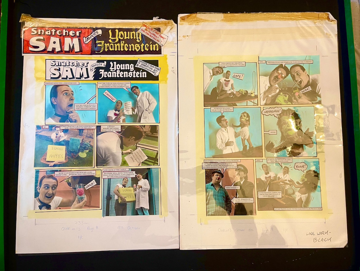 Starring Marc Riley as Snatcher Sam, Ian hand-coloured the strip using photographic dyes. He’d shown the OiNK editors some record covers and promotional band pictures of The Membranes from the early 80s, thinking the style would be a good fit. He would go on to use the technique on a lot of music magazine covers from 1987 onwards and one such image could take a day-and-a-half to colour. It was a difficult task but I’m so happy he took the time to add some of it to OiNK’s pages. Apparently the OiNK team randomly named his work ‘Glechnicolour’, as opposed to Technicolour.