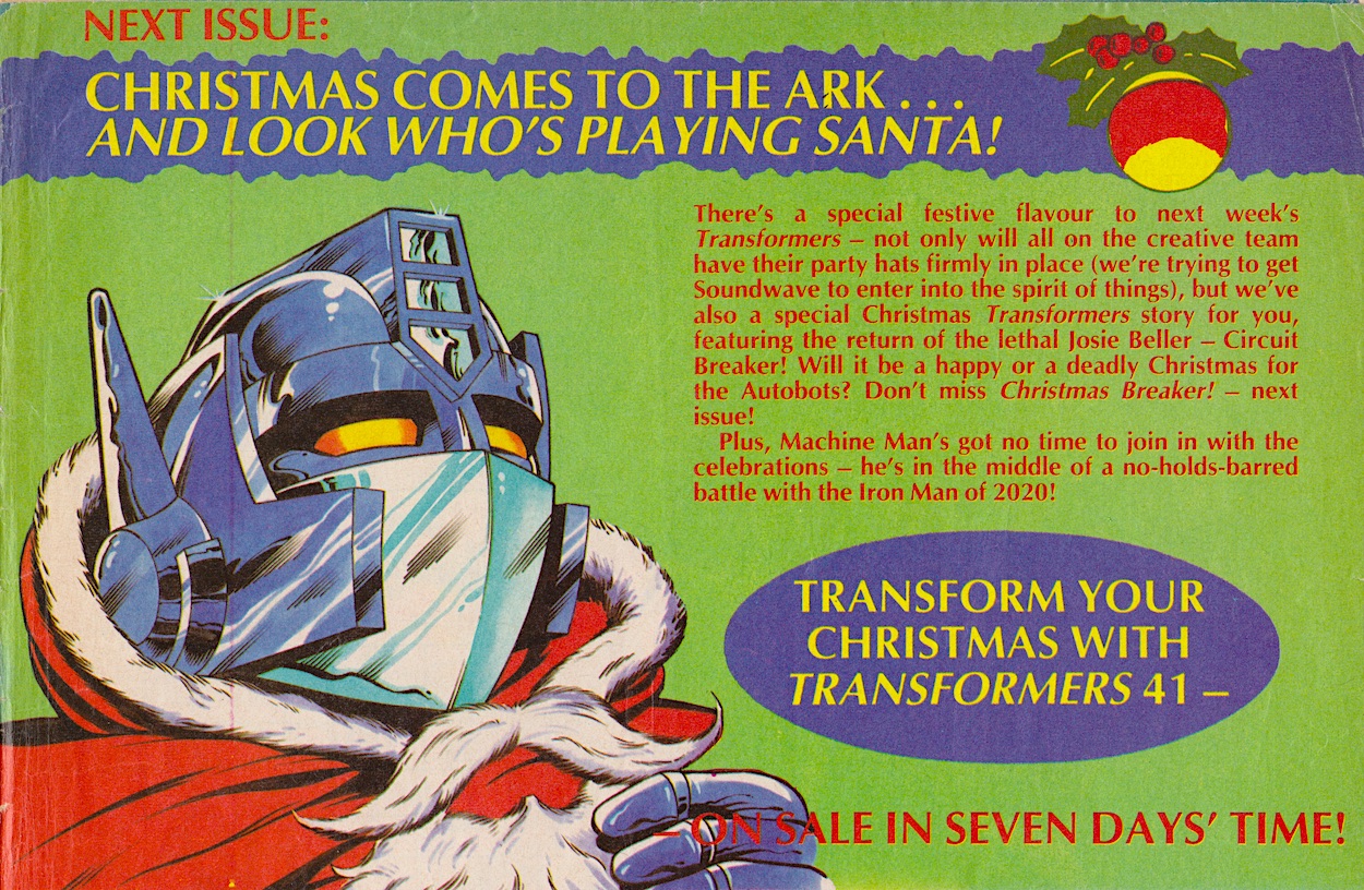There’s nothing else marking the season until we get to the final pages and that all-important Next Issue Promo with a very jolly-looking, fully costumed Optimus promoting the very first Transformers Christmas strip. Plus the return of Circuit Breaker! PLUS the Iron Man of 2020! Then there’s Prime dressed up as Santa Claus! What’s not to look forward to?