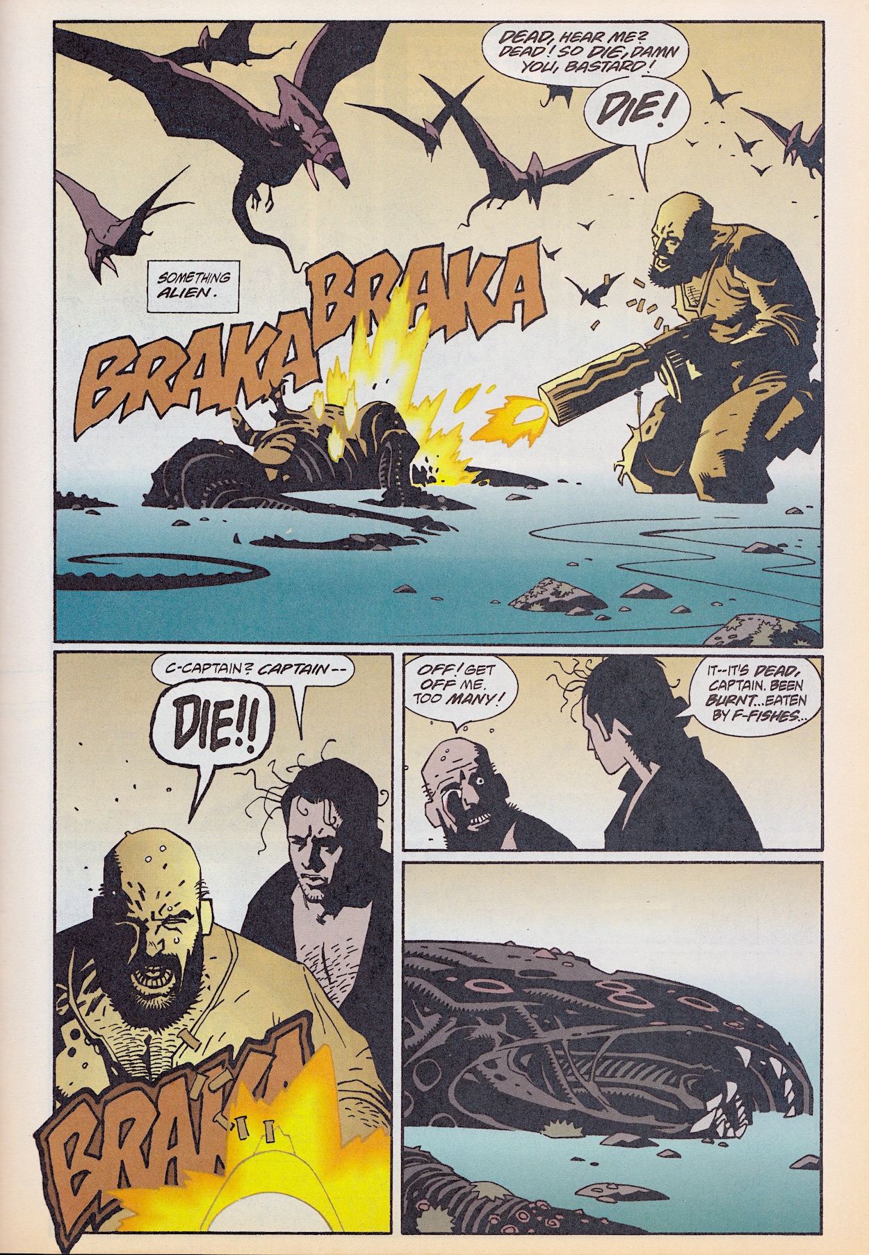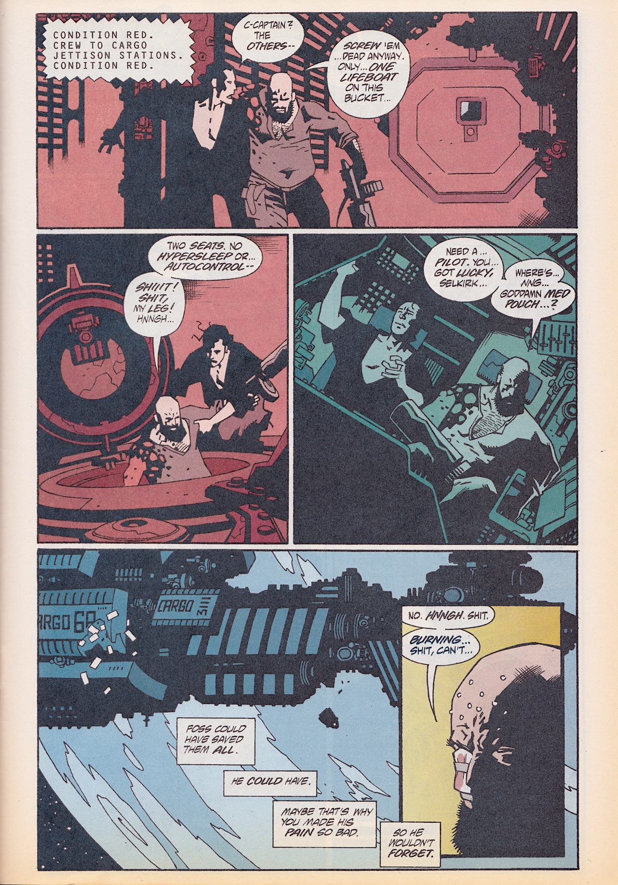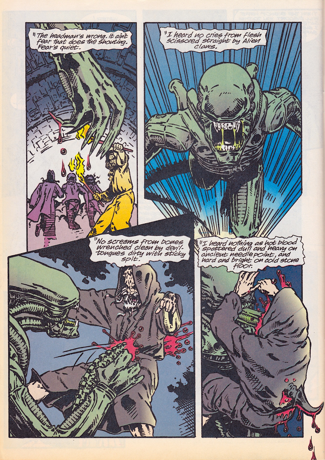 Mike Mignola, whose dramatic and original artwork I enjoyed so much in the comics adaptation of Bram Stoker’s Dracula recently on the blog (also see Hellboy, Rocket Racoon) makes his Aliens debut and these 15 pages are dripping in atmosphere, his art taking an already interesting story and making it absolutely compelling. And this is even before we’ve seen him really handle the aliens themselves. We only see part of one dead xenomorph here but that’s enough to have me anticipating the next chapter.