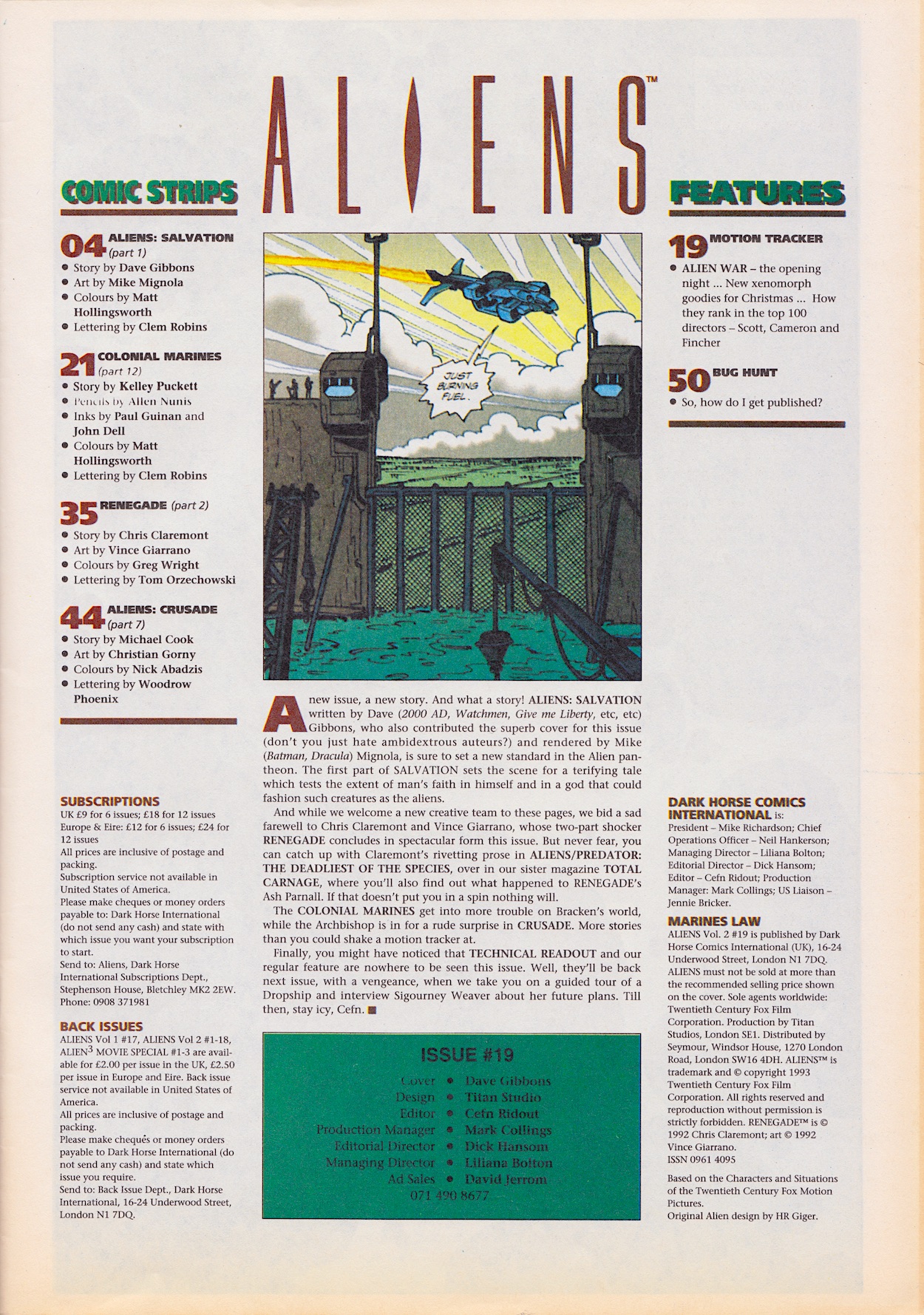 Dave Gibbons (Watchmen, Ro-Busters, Doctor Who) joins the Aliens fold at Dark Horse International with the brilliant cover and as writer on a new strip inside. Of course, long-time blog readers will have seen Dave’s work before on the site in the read throughs for OiNK, Death’s Head and Dragon’s Claws, as well as a post about his autobiography Confabulation, so it’s great to see his work back on the site, especially in this comic. A comic which is very strip-heavy this month.