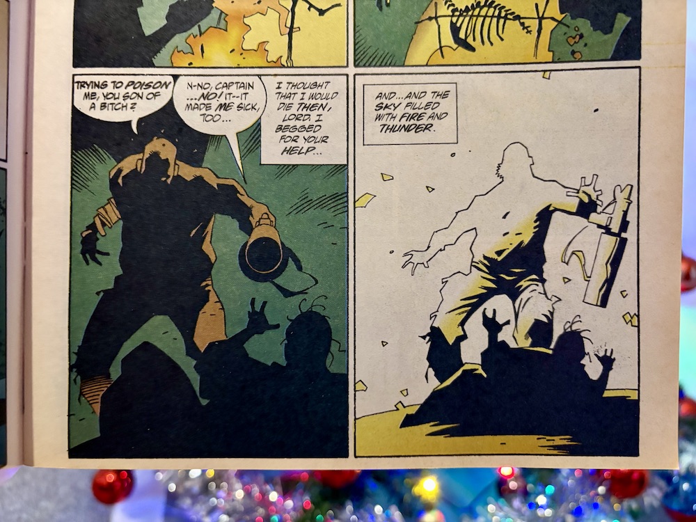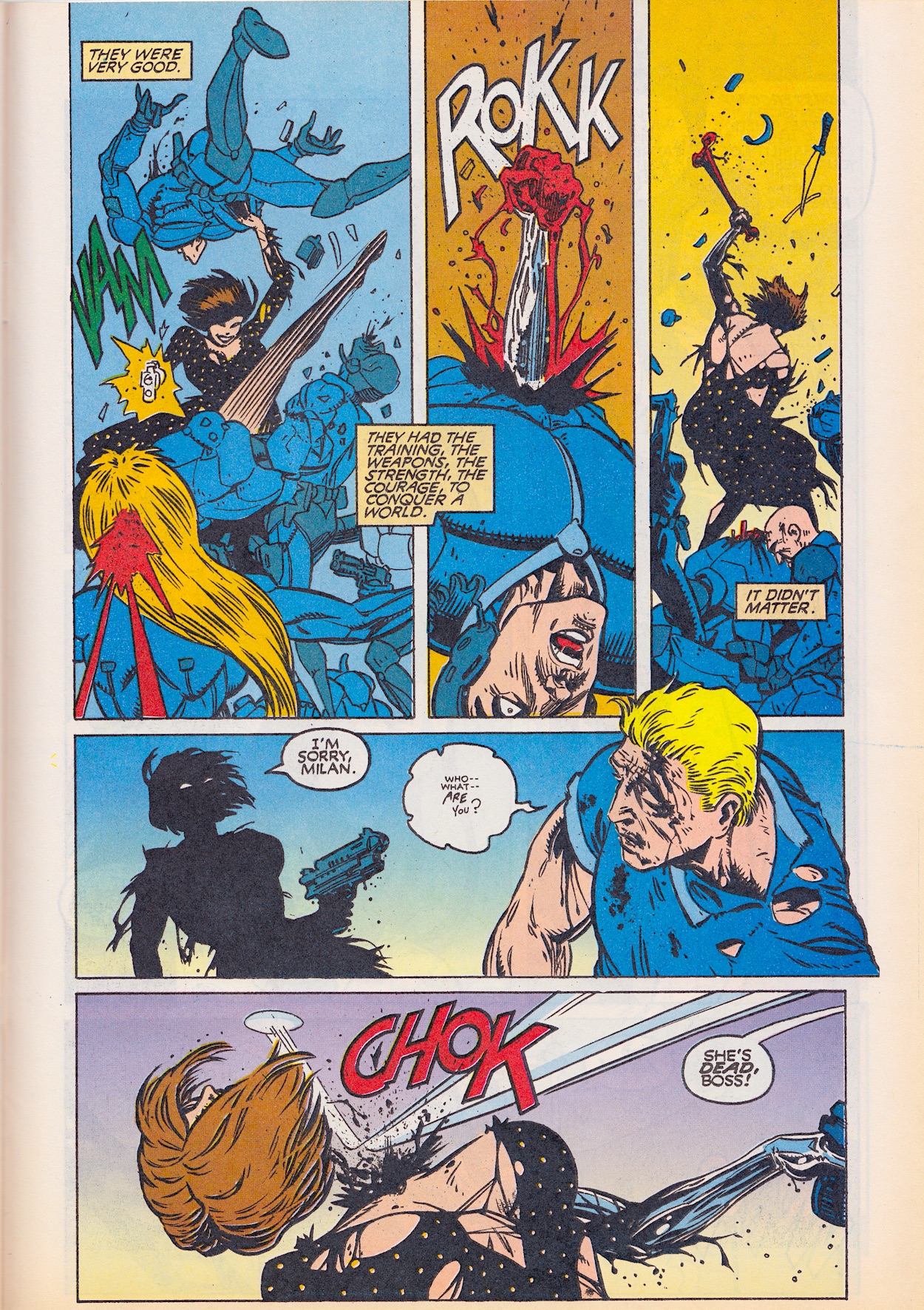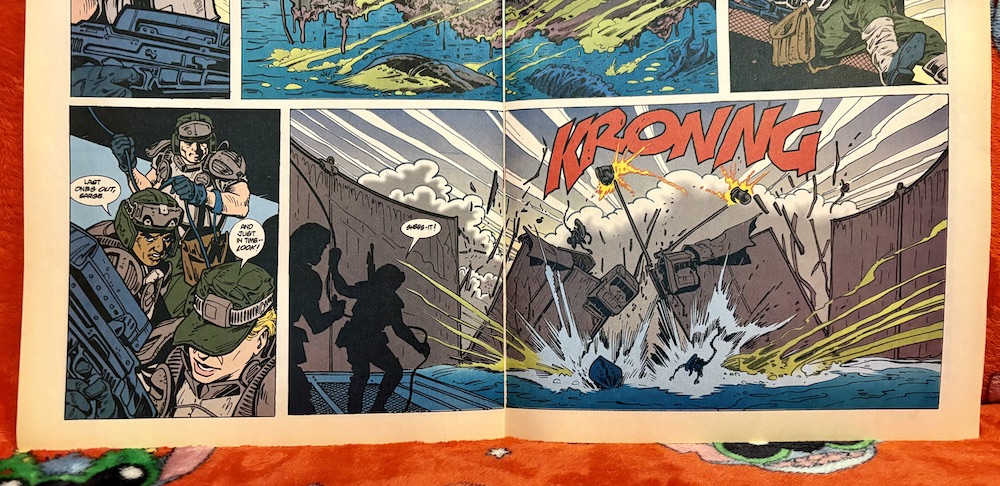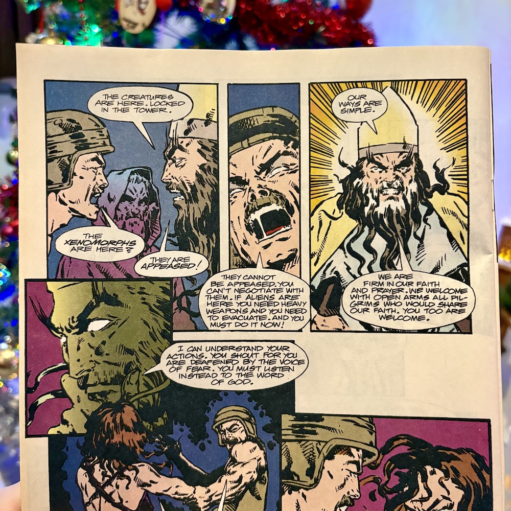 The Ransome ship’s security spot a small 12-year-old girl on a hill with binoculars watching them and immediately classify her as a threat, despite clearly identifying her as a child. When they take aim, meaning to kill her, Ash takes them all out. I’ll admit, it’s a thrilling read and in places Vince Giarrano’s art is powerful! But it’s all tempered by my original point, that it’s being used to promote Total Carnage to Aliens readers, while we miss out.