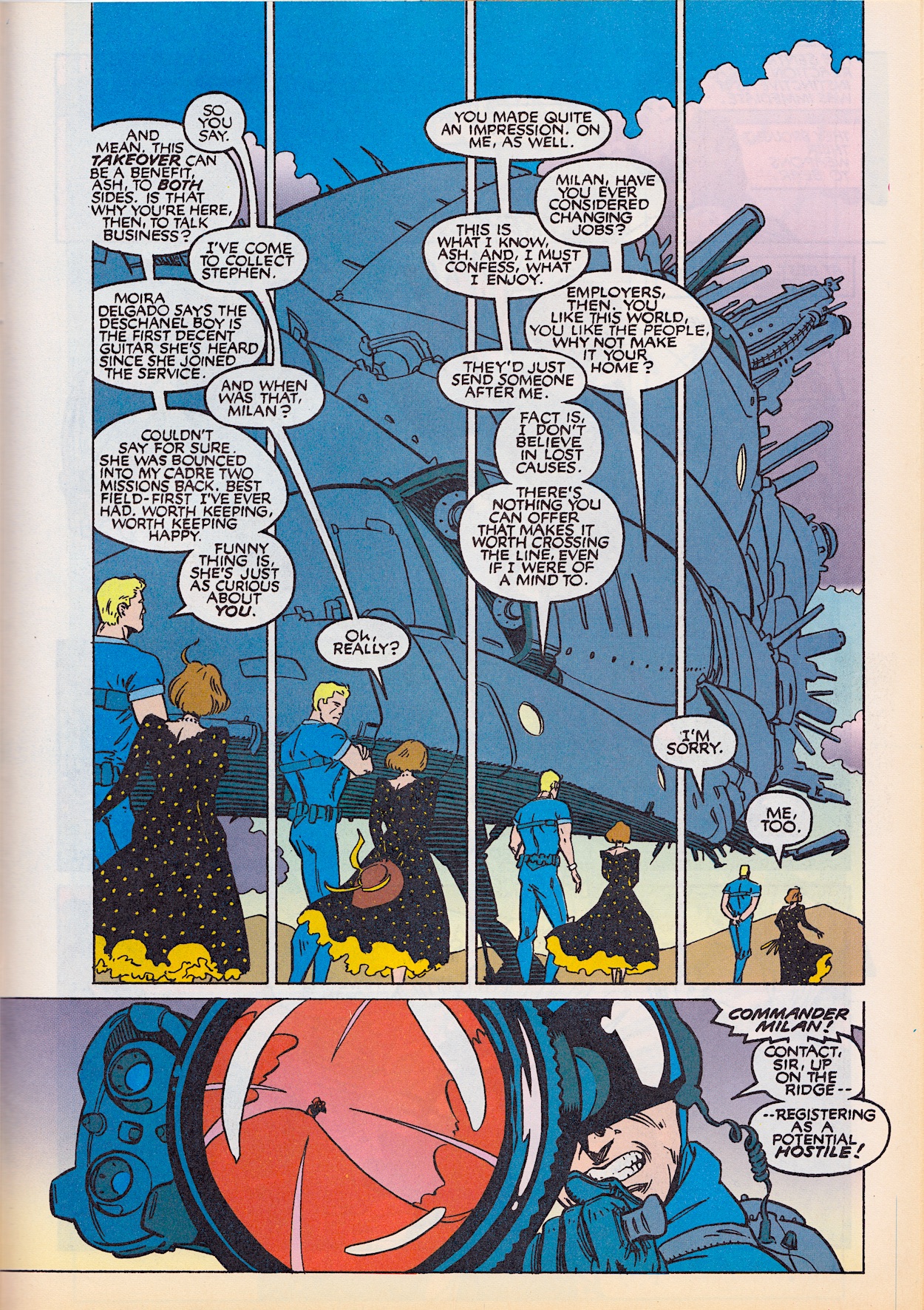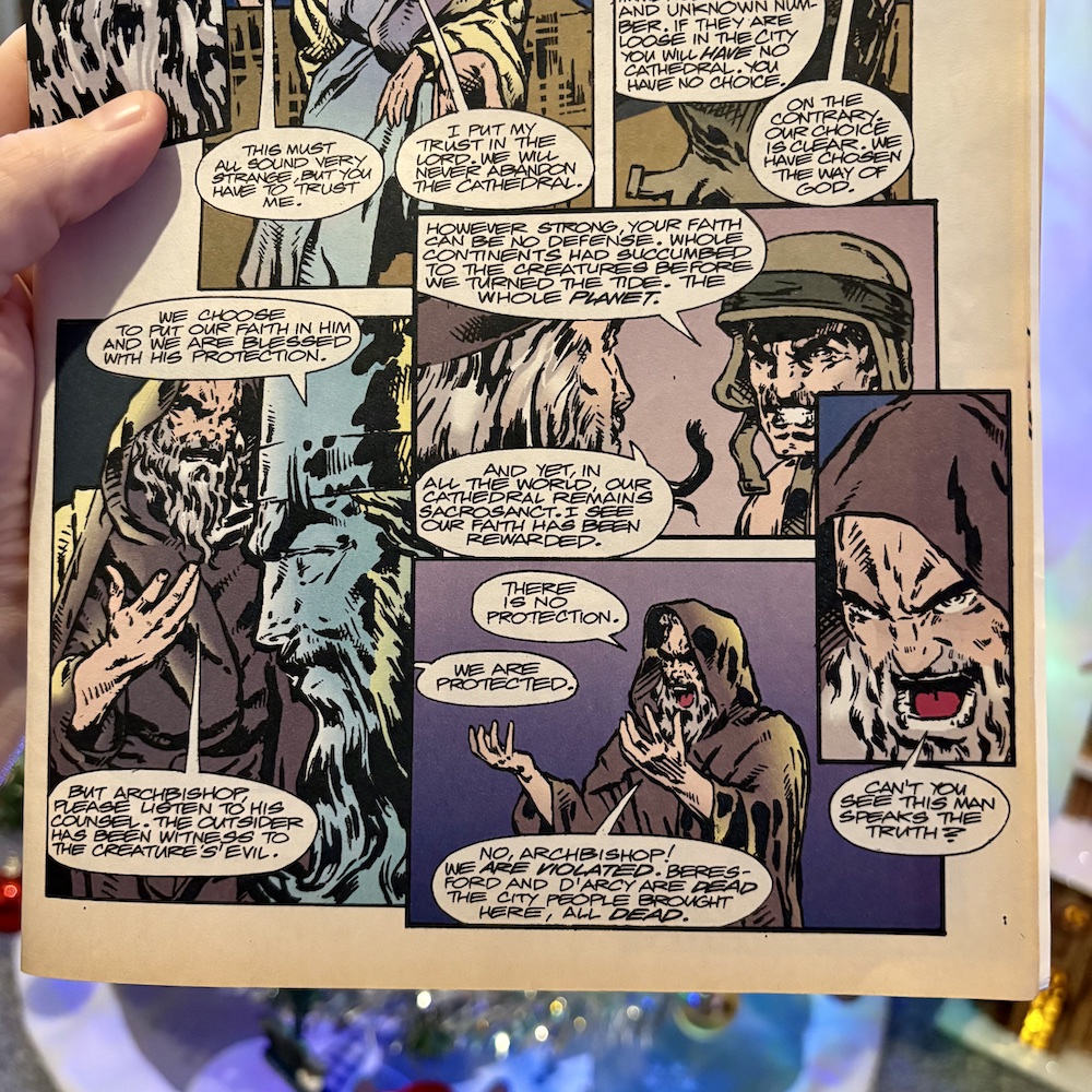 Crusade may have been the UK exclusive strip at the time but with everything else included this month it’s been reduced to a measly five pages and it suffers as a result. Foston and Rani try to explain to the Archbishop they need to evacuate the cathedral because the aliens are loose in the city. When he can’t convince them to put their faith in god he finally admits he’s been sheltering the aliens in the tower.