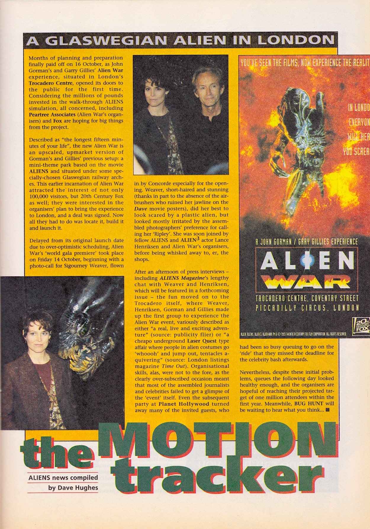 In the Motion Tracker news pages Dave Hughes tries his very best to provide yet more hype for the interactive Alien War experience by reporting on its grand opening night. However, it still doesn’t come across great, does it? I had my doubts when it was previously announced it’d been cut down by half to squeeze more people in each day, and I think I was right. I also think he’s imagining things with the Dave movie poster.