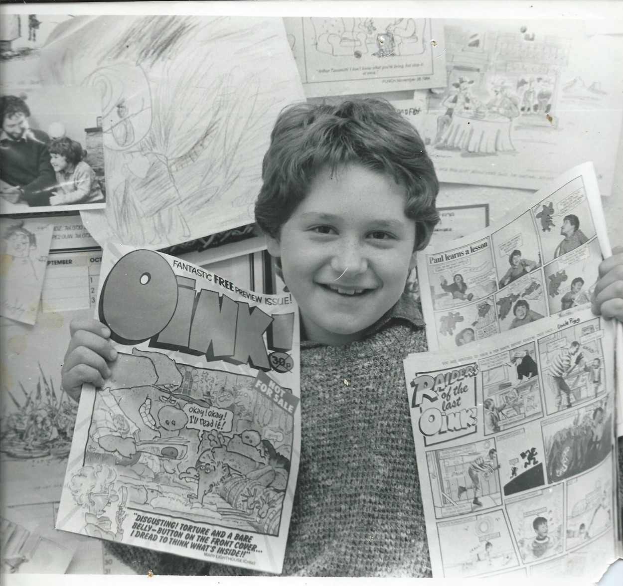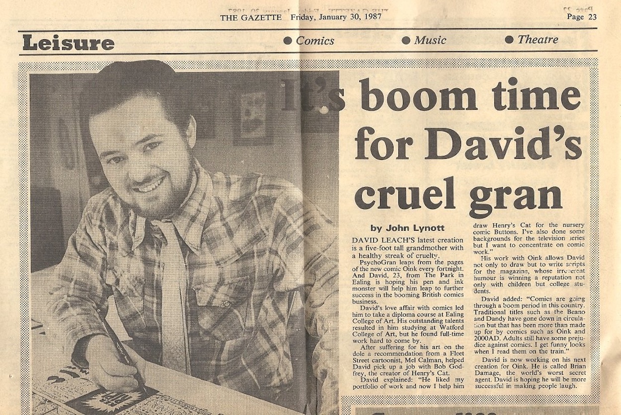 Jeremy’s photo reminds me of the comics my friend Roger and I created as kids. Roger created The Battle-oids, The School Busters and The Wally, while I created WarBots, The Real Smoke Busters and The Idiot. (Hey, he inspired me!) Also, together with our friend Bruce we made a monthly comic for our primary school classroom called The Moo! But anyway, back to the OiNK team and David Leach (Psycho Gran, Dudley DJ)