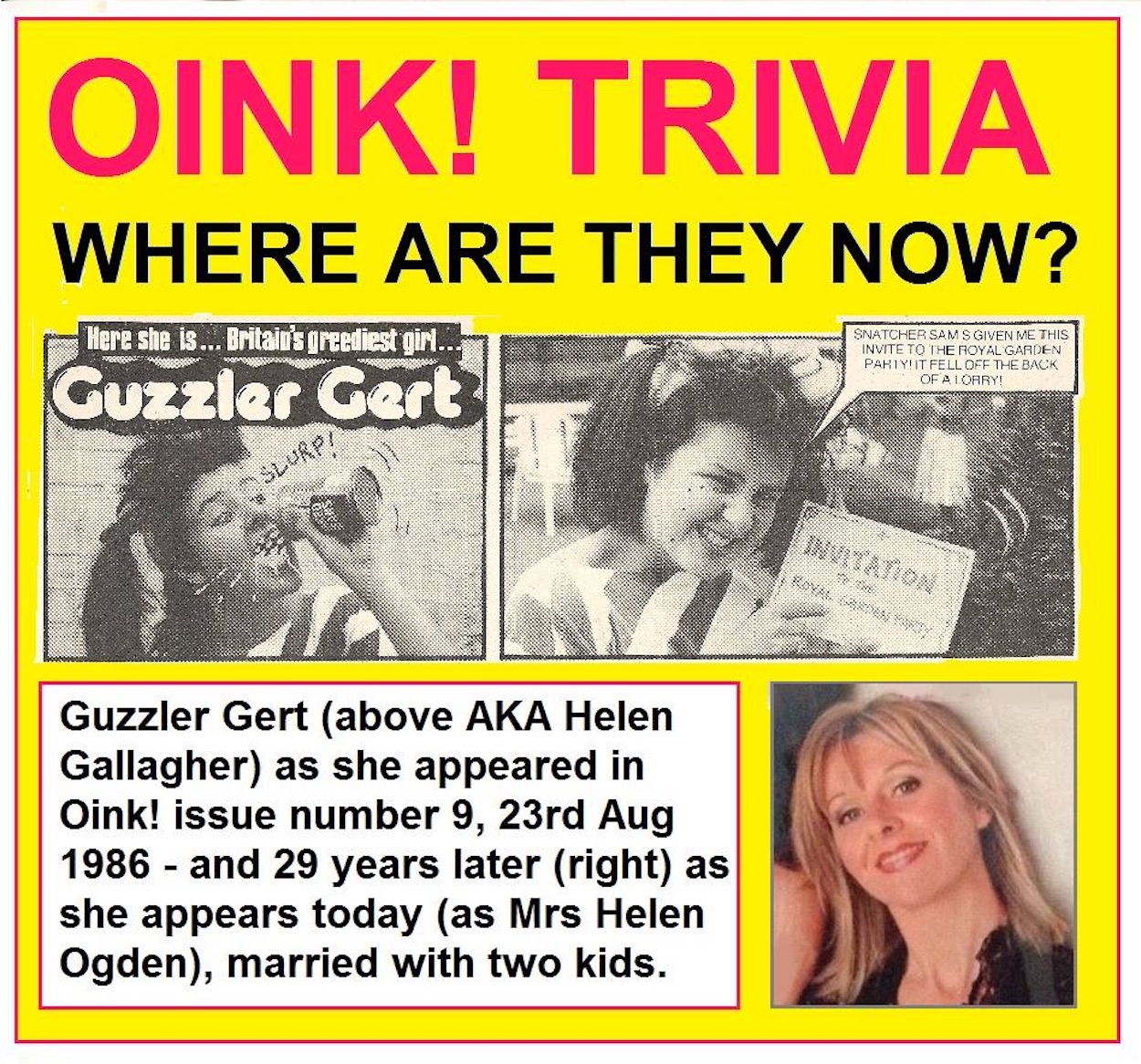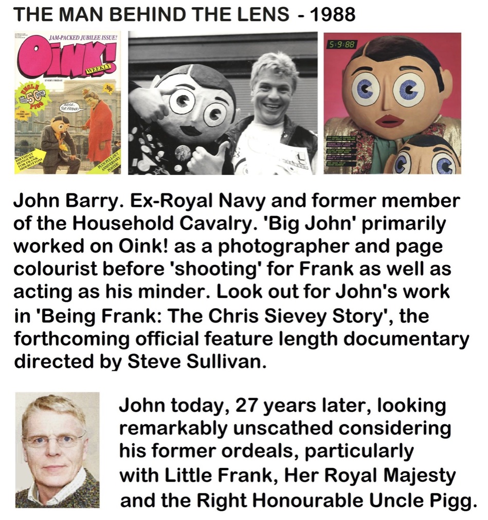 Co-editor Patrick Gallagher has shared a plethora of old photographs both online and over our email exchanges, often jazzing them up with graphics and behind-the-scenes insights, such as these example. Below, you can see OiNK photographer John Barry with a rather familiar looking crocodile in front of him, but it’s the unfinished sculpture in the background that caught my eye, hence the superimposed OiNK Book 1989.