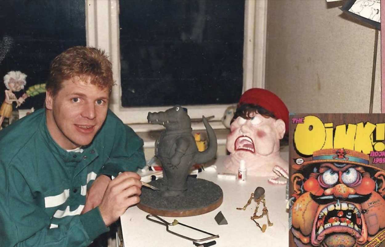 As described by Patrick, “John also helped out when we were pitching the TV show Round the Bend. Here he’s sculpting a model of Doc Croc in clay and on the desk in the background is a cast from a previous sculpt based on the butcher on the cover of The OiNK Book 1989. Also on the desk is a junior hacksaw he moulded from Play Doh.” Typical Patrick!