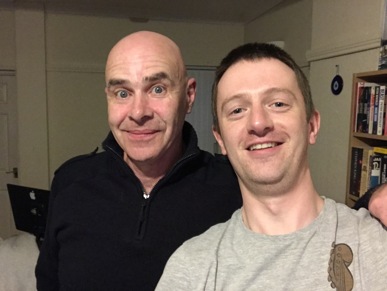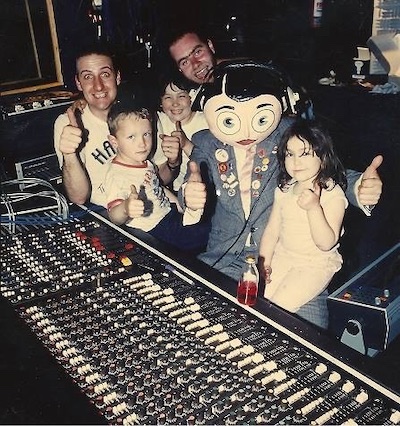 The next photos will be rather small when you click on them because that’s the size they were when shared by Patrick. First up is a photo of him and Marc Riley (of The Fall and BBC 6Music and creator of Harry the Head, Doctor Looney and When Dinosaurs Ruled the Earth) on holiday, followed by a shot of some lucky pig pals getting to sit in on the recording of the OiNK 45 record. Not only did they get to meet Patrick and Marc (fresh back from that holiday and rather tanned), they also hung out with Frank Sidebottom himself, Chris Sievey. Then, a photo of Patrick with someone who didn’t work on OiNK but who you just might recognise.