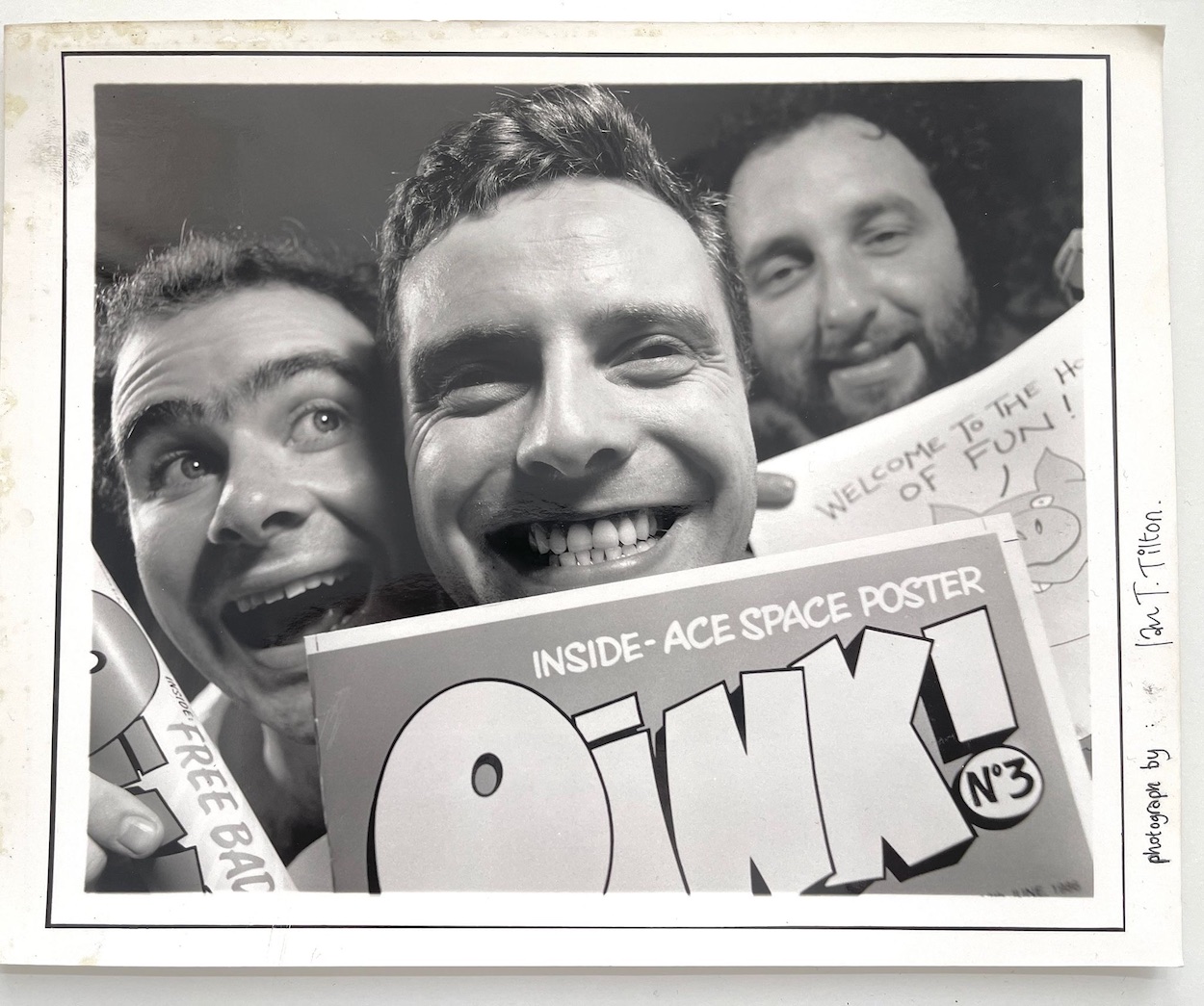 He also photographed the equally iconic (in my eyes anyway) cover to The OiNK! Book 1988 and there’s a special post about that cover and Ian’s other OiNK work which went up on the blog earlier this Christmas season. Something less plasticine based and more liquid based is next. Ian first met the OiNK guys at its launch party in some nice, plush pub in Manchester when he’d been asked to come along and take a portrait of the three editors for some pre-publicity. Family and friends were all watching as Ian attempted the photo session. “Attempted” being the operative word.