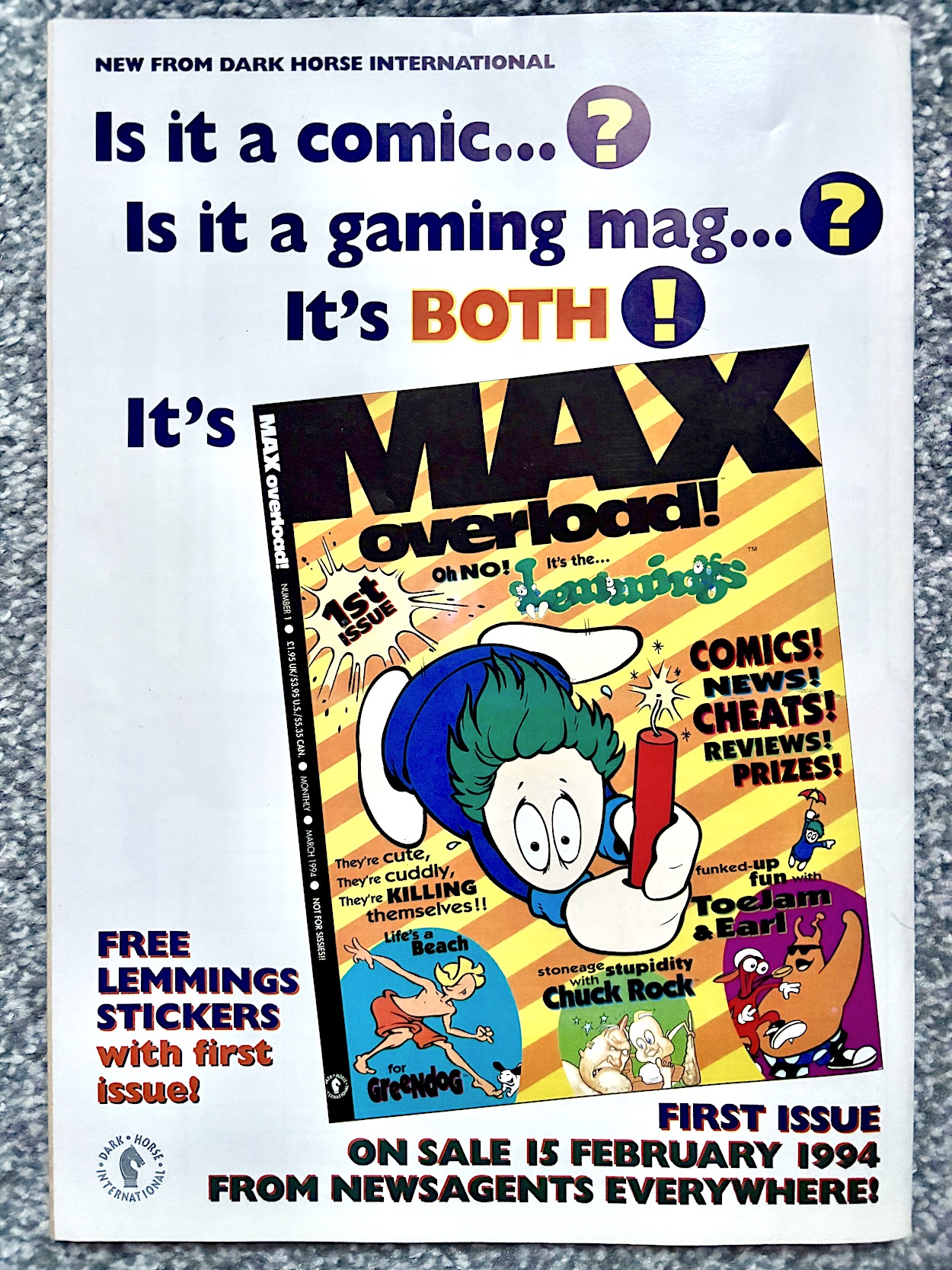 Back in #7 of Jurassic Park there was a teaser advert for the upcoming gaming magazine/comic hybrid, Max Overload. I remember later adverts focussed on certain videogame characters alongside a random list of features and it always seemed like a rather cringey idea, even back when I was the target audience. We had our computer and video game magazines, we had our comics, but to join them together always seemed unnecessary. This launch advert from the back page doesn’t change my mind.
