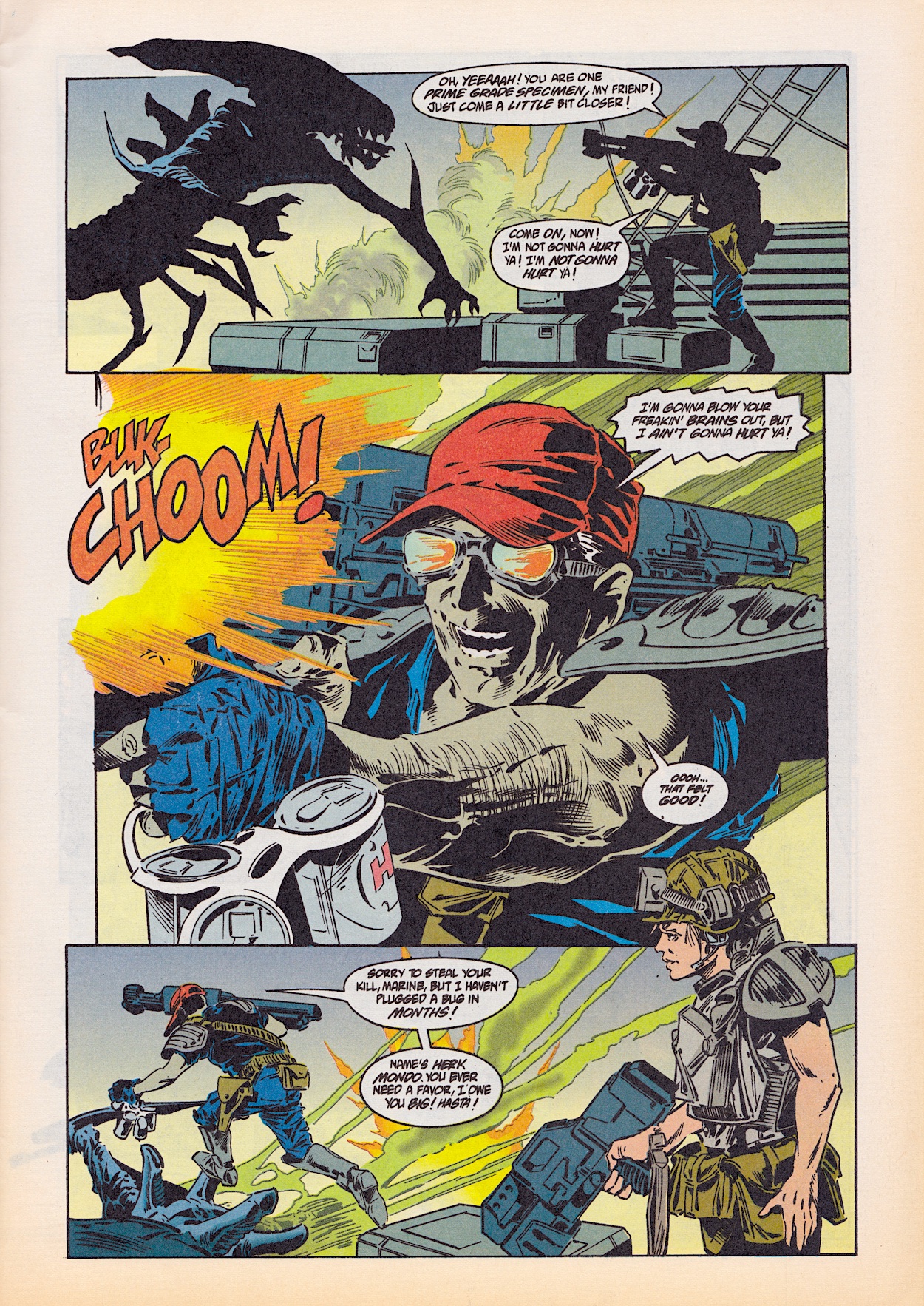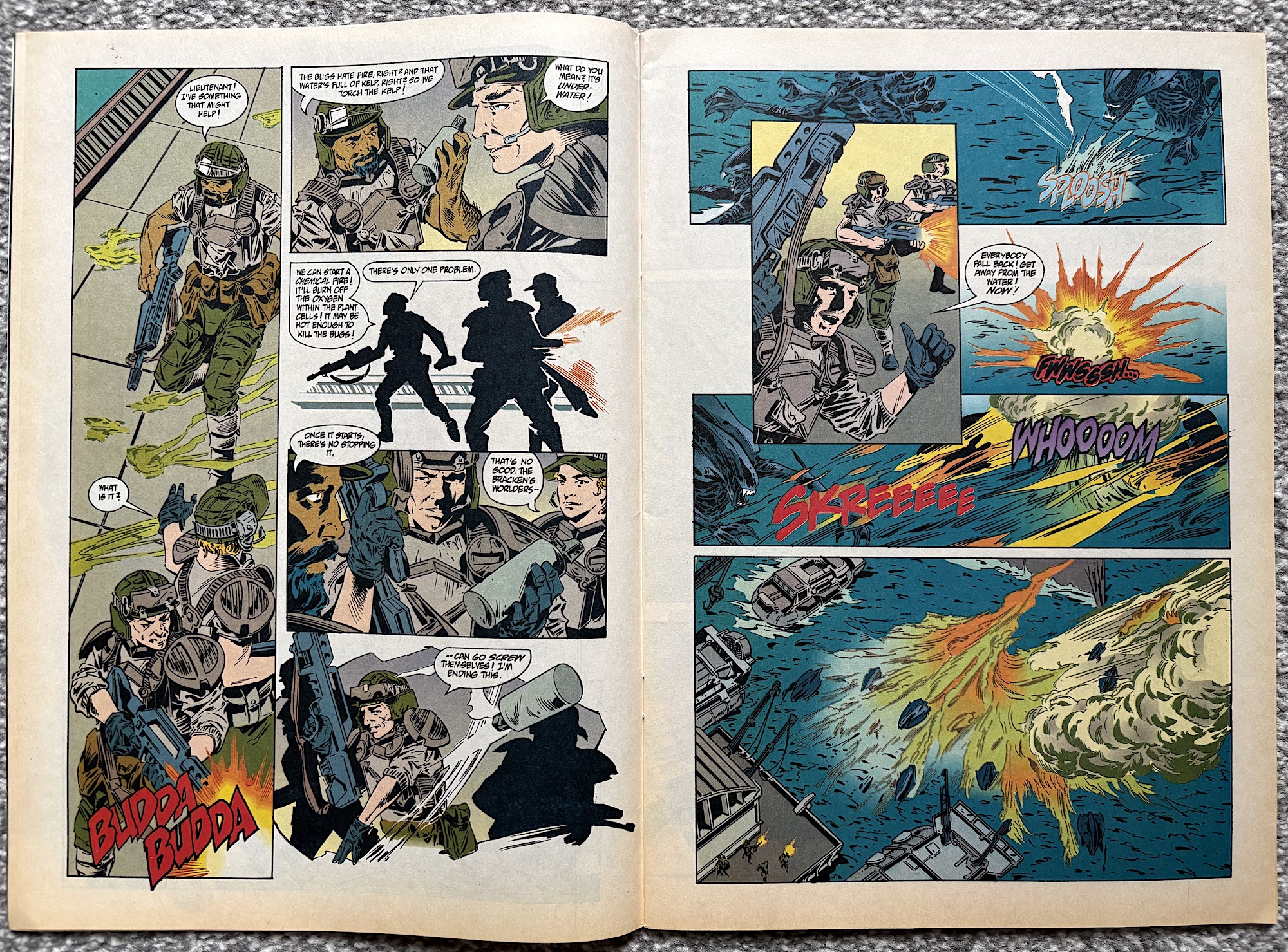 At one point Vasquez is rescued by a new random character called Herk Mondo, some “legendary” alien killer. This was his first appearance and I instantly disliked his inclusion. Having a lone man capable of destroying hundreds of aliens reduces the xenomorphs to nothing more than pests. It feels like Kelley has backed himself into a corner; a cleansing fire and sudden appearance of a randomer to save the day at the last second is a hugely unsatisfying resolution to a months-long part of this story. Mondo would go on to star in his own comic but that doesn’t make this feel any less than a conclusion plucked out of thin air at the last moment.