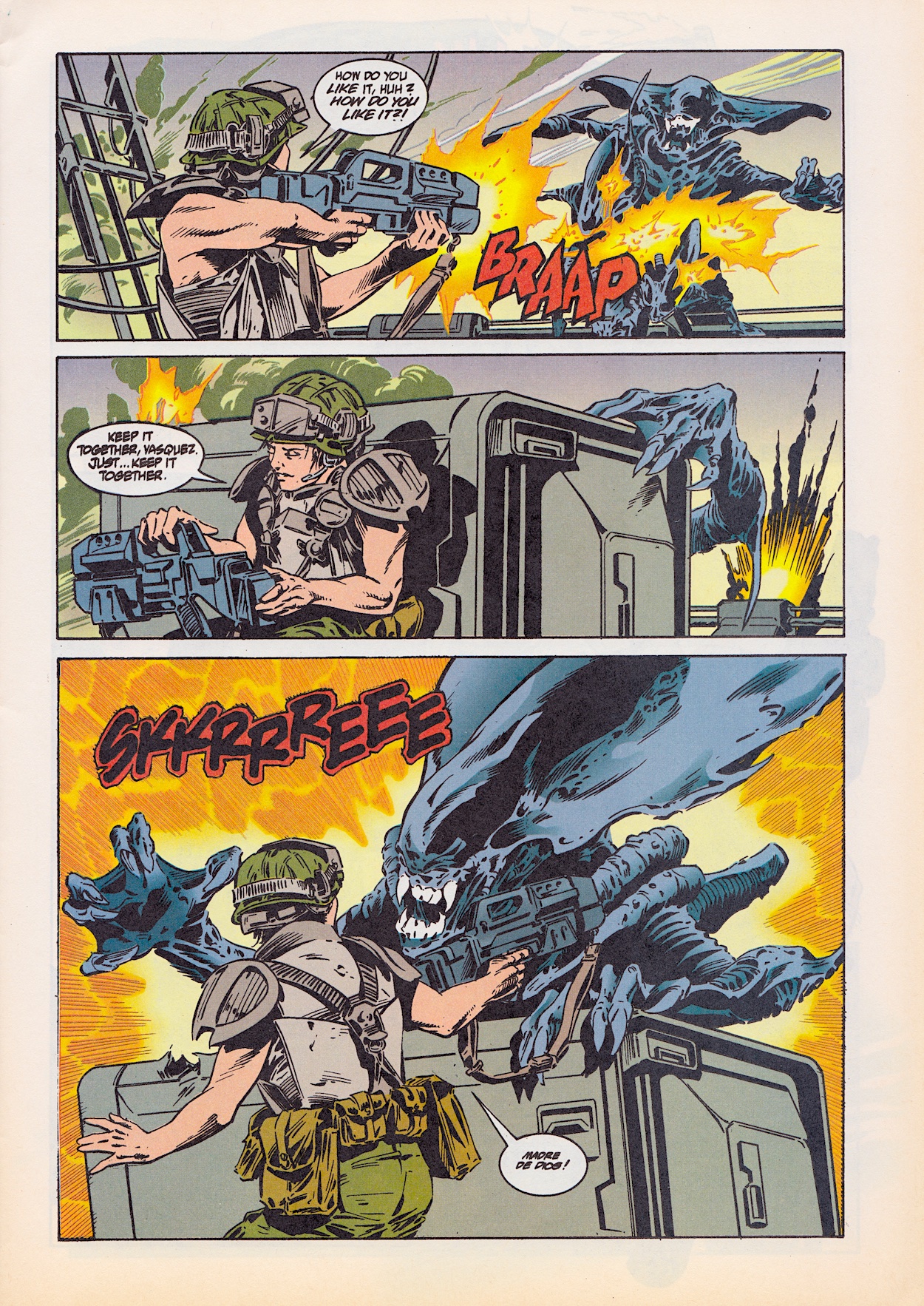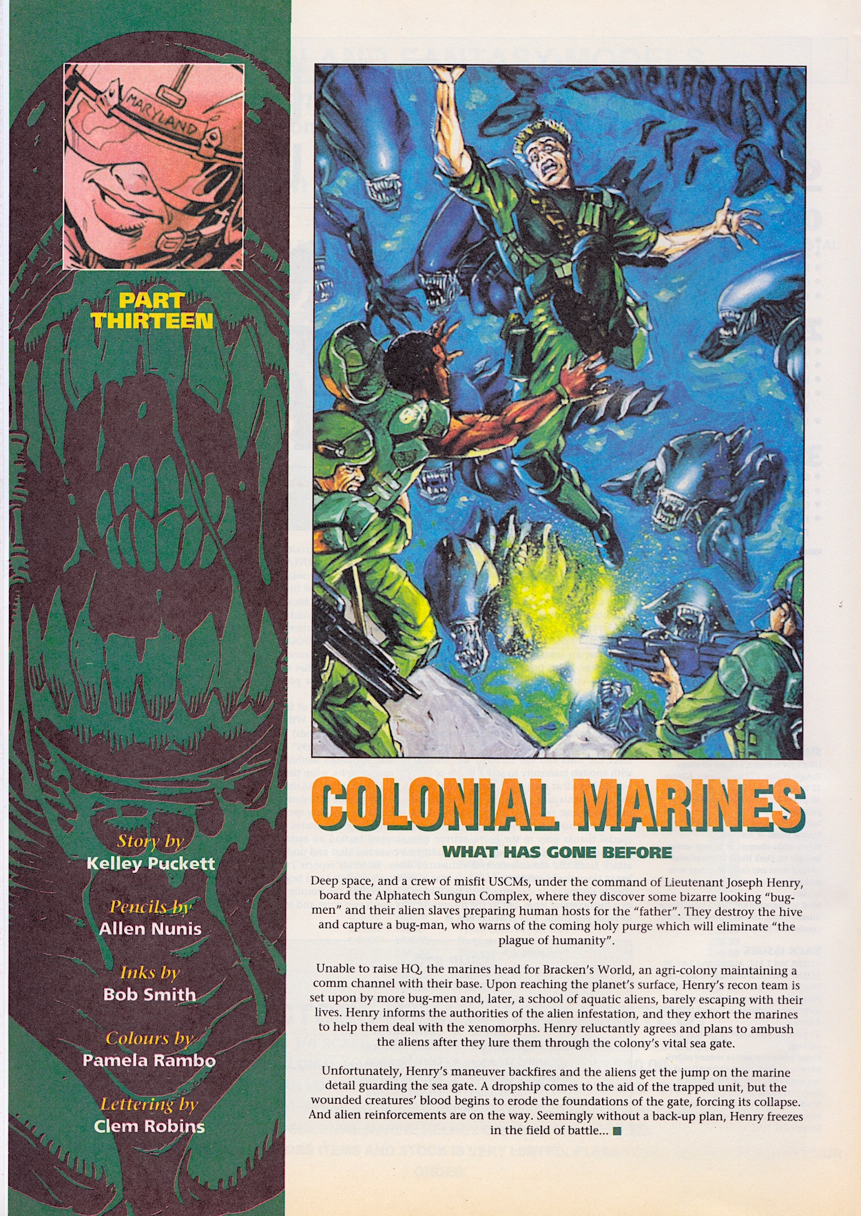 You’d think they’d have had more than one person to play the alien! Anyway, there are your credits for the issue and it’s straight on to the strips and their recap pages have all been given a fresh new look. These are much better, more informative, look great and carry the credits so you don’t have to look back at the editorial to see whose work is terrorising you. Up first is part 13 of Colonial Marines written by Kelley Puckett and unfortunately it’s one of the weakest chapters thus far.