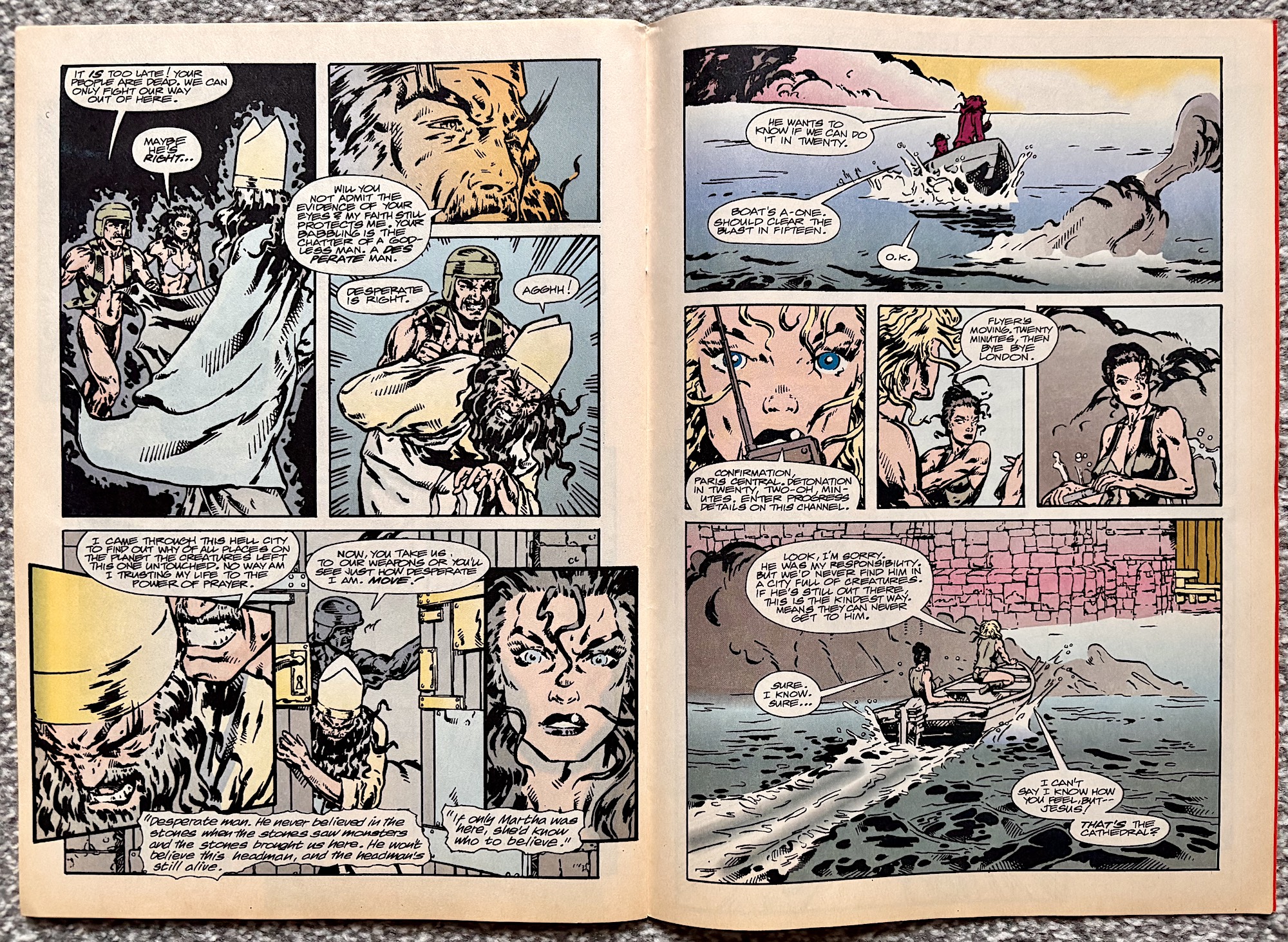 UK strip Crusade’s eighth part runs to eight pages and while the art can once again be confusing in places, for the first time every single character featured is well developed and the inter-personal drama is superb. So it appears the Archbishop has been trying to save the city, albeit with human sacrifices! The missing ship crashed through the church, spilling the alien eggs into the Thames from where he’d been able to contain the threat, tying up two of the mysteries including why London had apparently been spared (it hadn’t).