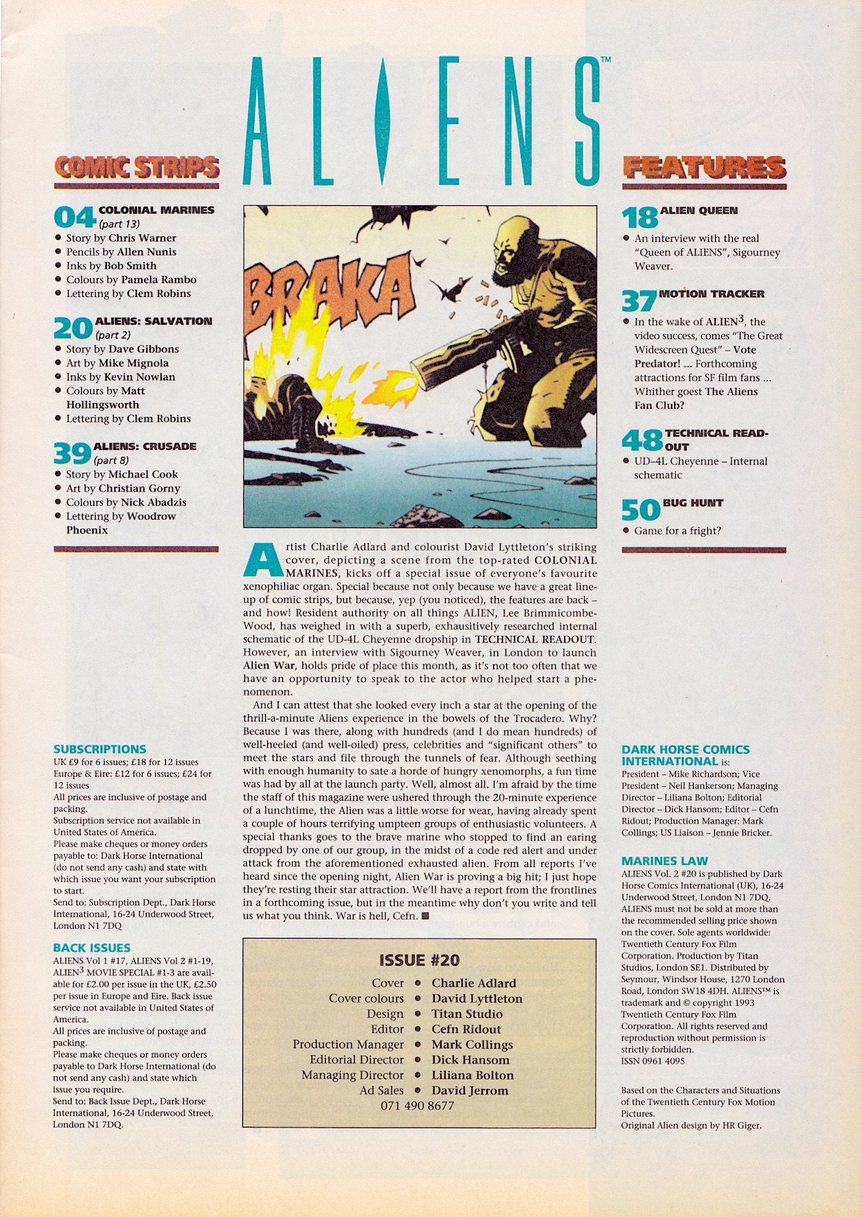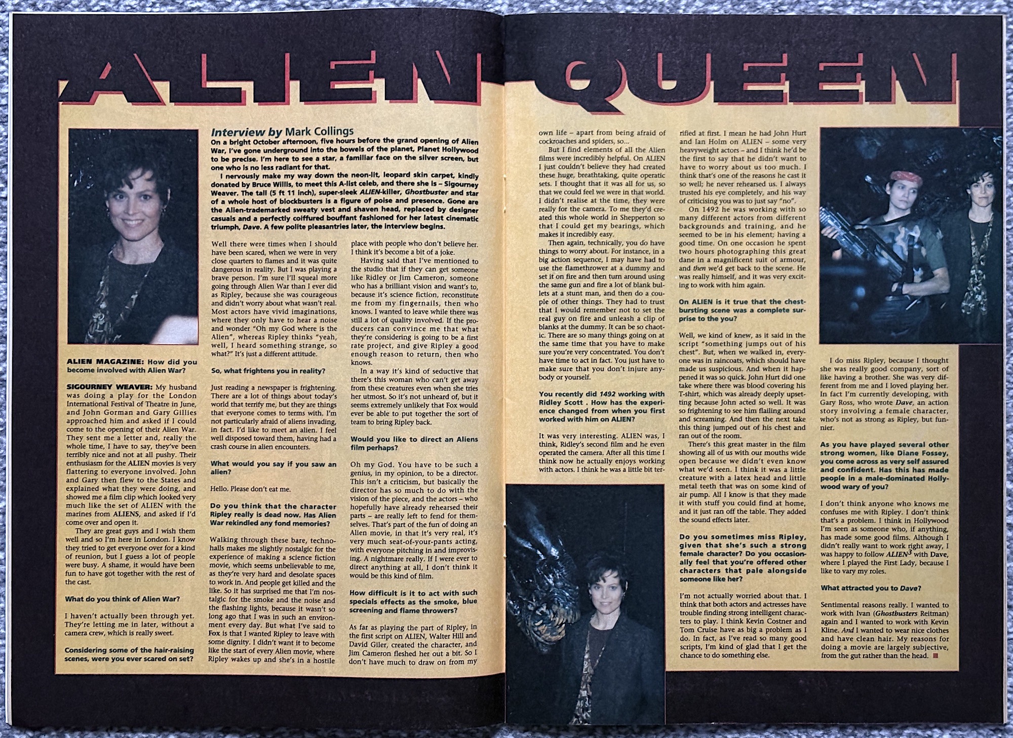 I have to say I question the editing of this interview. Sigourney’s answers read like very stilted responses, certainly not like her from the countless interviews I’ve watched over the years. Maybe they’ve been badly edited to fit two pages, or taken from quickly scrawled notes at the Alien War grand opening. A shame, as the information in here is fascinating.