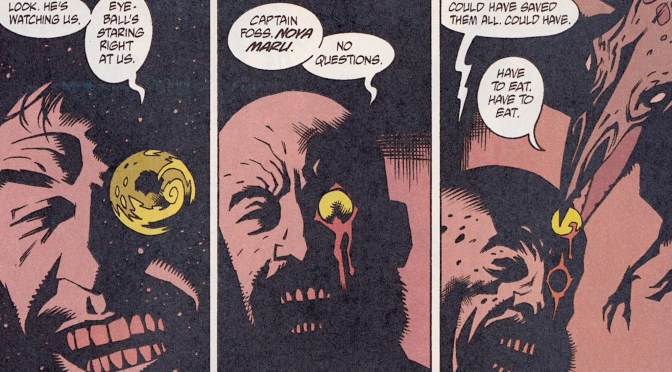 The second part of Dave Gibbon’s Salvation takes up a whopping 16 pages of the issue. Days after killing his captain, Selkirk is still eating his rotting flesh when he finally stumbles across the crashed ship, but he’s being driven mad by fear while he’s awake and by terrifying nightmares when asleep. First Officer Dean shows up to rescue him and of course Selkirk instantly believes this proves god is watching over him.