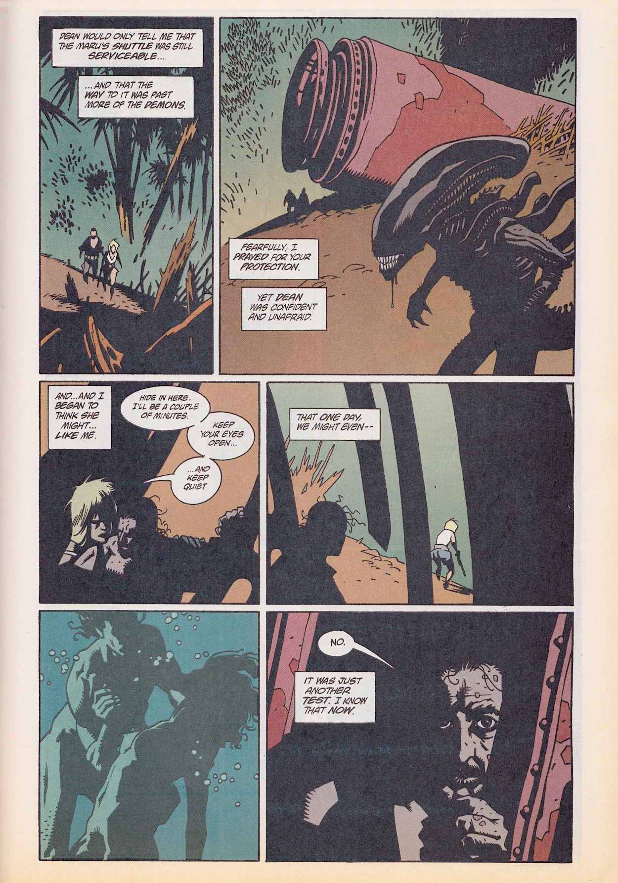 Falling down a multi-tiered waterfall gives them ample distance from the xenomorphs and a chance to catch their breath. Quietly, mind you, as they shelter in a hideout and the aliens begin to stalk nearby. Selkirk starts thinking Dean likes him, that that’s why she came back for him and he starts imagining having sex with her, before coming to the conclusion that god didn’t send her to rescue him, but to test him. The guy is quackers. And a creep.