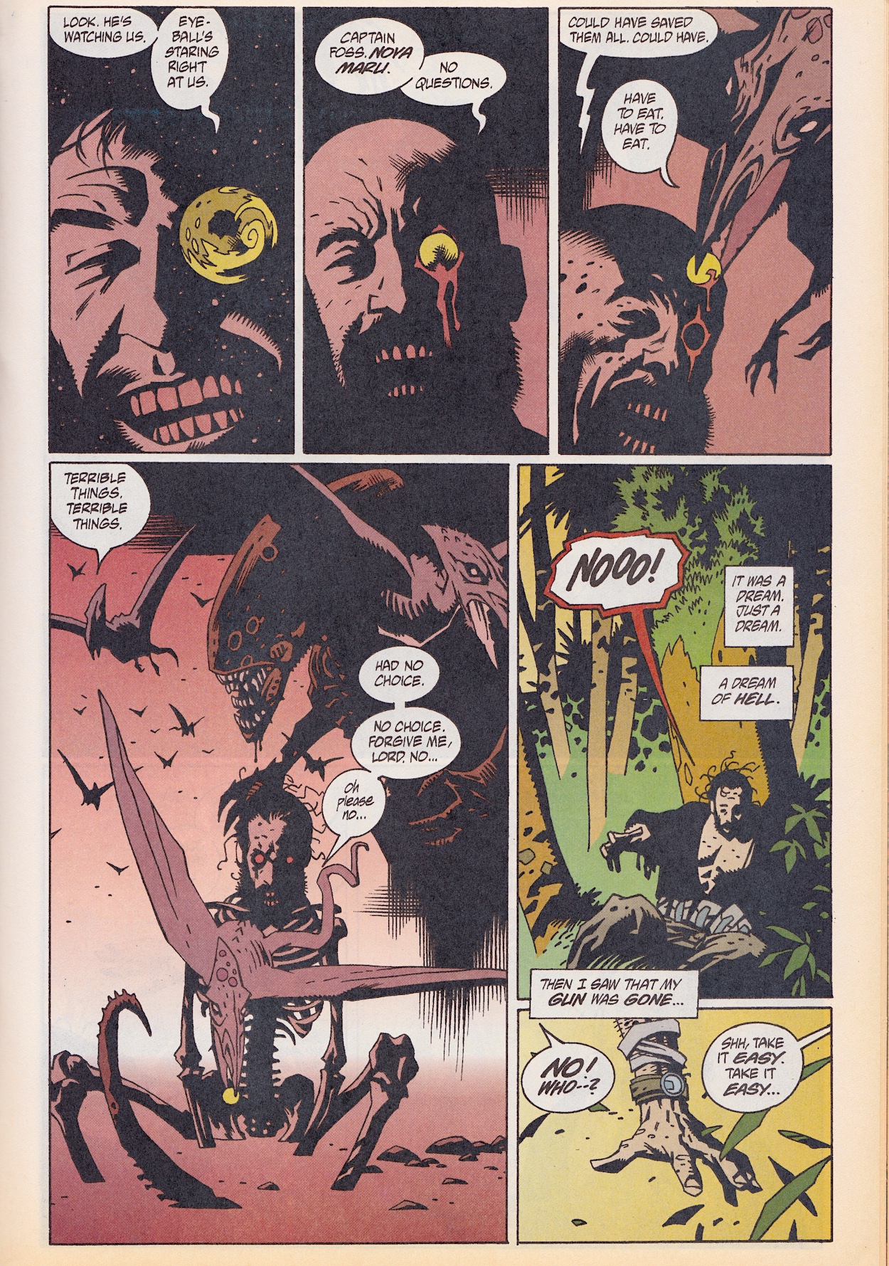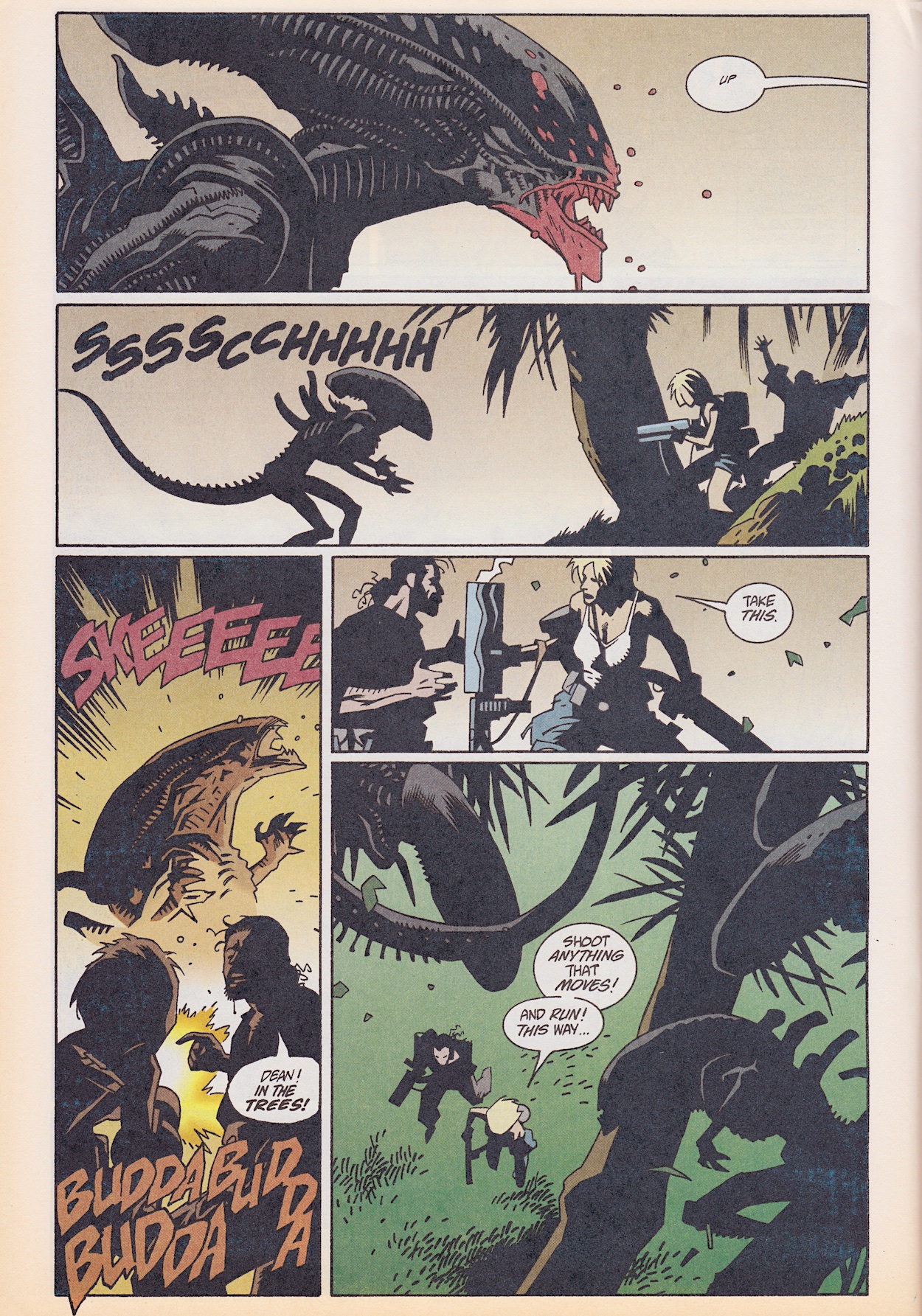 Dean sets a charge, attracts the aliens, then they make a run for it and detonate the bomb, taking out most of the creatures. Not all though, as Selkirk finds out when he doesn’t see a wire on the ground, trips over it and falls flat on his back in front of an alien for this month’s cliffhanger. There’s a lot to like here, and a lot to love above Mike Mignola’s shadowy, atmospheric art in particular.