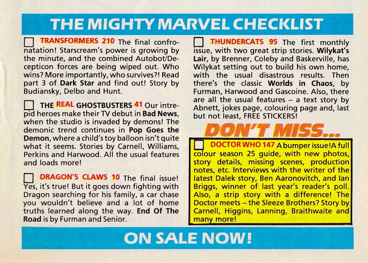 How strange that the previous issue of Thundercats’ was the one to bring a brand new look to the comic instead of waiting until the first monthly issue to do so. It now contained two strips, the first was all about one of the most annoying cartoon characters ever while the other was a reprint. I don’t think it lasted too long after this if my memory of these checklists serves me right. Dragon’s Claws #10 missed out on top billing again but the ‘Don’t Miss’ title this week is rather special for us because it’s actually been covered on the blog before.