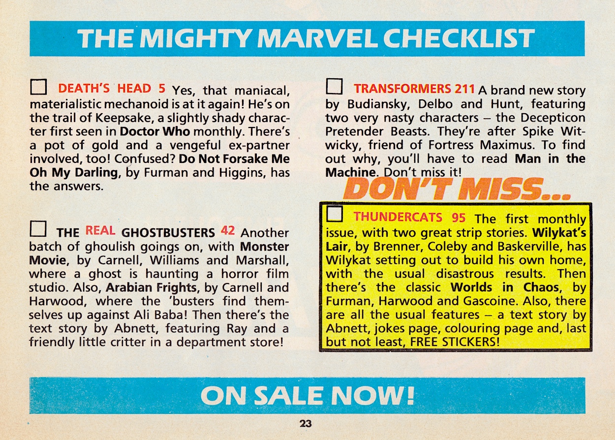 Despite being an excellent issue and a sequel of sorts to a strip in Doctor Who Magazine, the first appearance of Death’s Head’s fifth issue wasn’t important enough to knock the first monthly Thundercats issue off the top spot. Thundercats seems to be getting the ‘Don’t Miss’ spot more than any other comic. They were really trying to push it, weren’t they? What else were they pushing at us this week, adverts-wise? Two Spring Specials, that’s what.