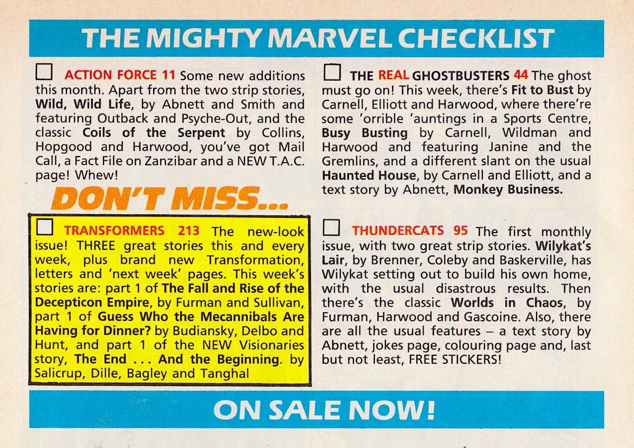 My friends who were long-time Transformers readers weren’t too enamoured with the new three-story format in the newly-retitled Transformers and Visionaries. We now had a pair of five-or-six-page Transformers stories (and the same size of back up) every week but they preferred the previous 11-page strip and found it hard to adjust. I was used to Fleetway’s action comics though, so this felt like an upgrade over the previous format, even if it took a while before the UK strips were written for the new format.