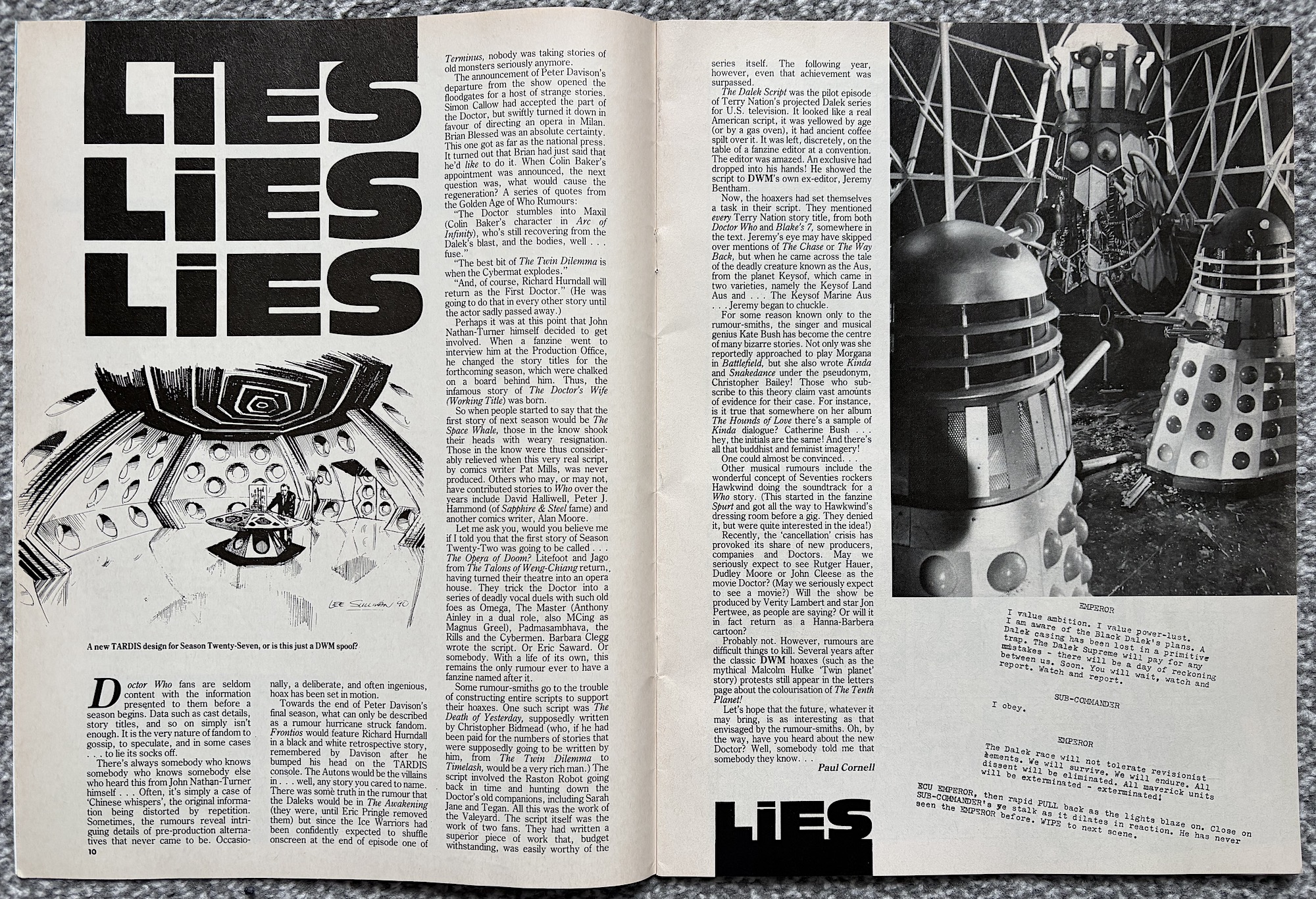 Somewhat tied in with that news page is Lies Lies Lies, a feature looking back on the wild rumours and blatant lies people had made up about Doctor Who in the past just to get some attention. It’s somewhat ironic to have this in the same issue as that news page, don’t you think? I reminds me of social media today, or even discussion forums before that, and the things included here are the reason I no longer look out for future Knight Rider (or Doctor Who) news anymore. Some things never change.