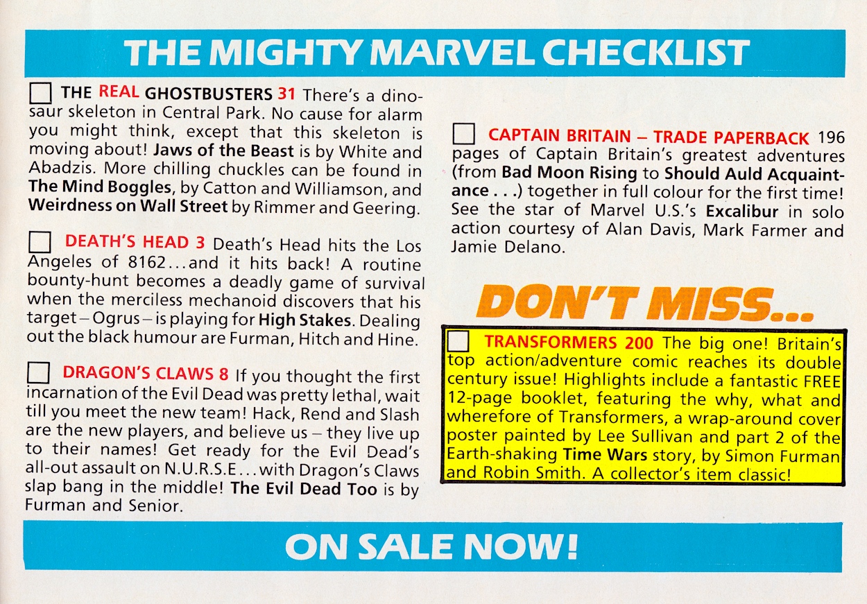 Action Force Monthly #8 and Death’s Head #2 continued to entertain through the school holidays. What, you mean you only read your comics once and not multiple times between issues? I’m surprised The Real Ghostbusters isn’t the ‘Don’t Miss’ title, what with it being the only one celebrating what day it was, but instead Thundercats #90 takes that honour in what seems a rather random choice.