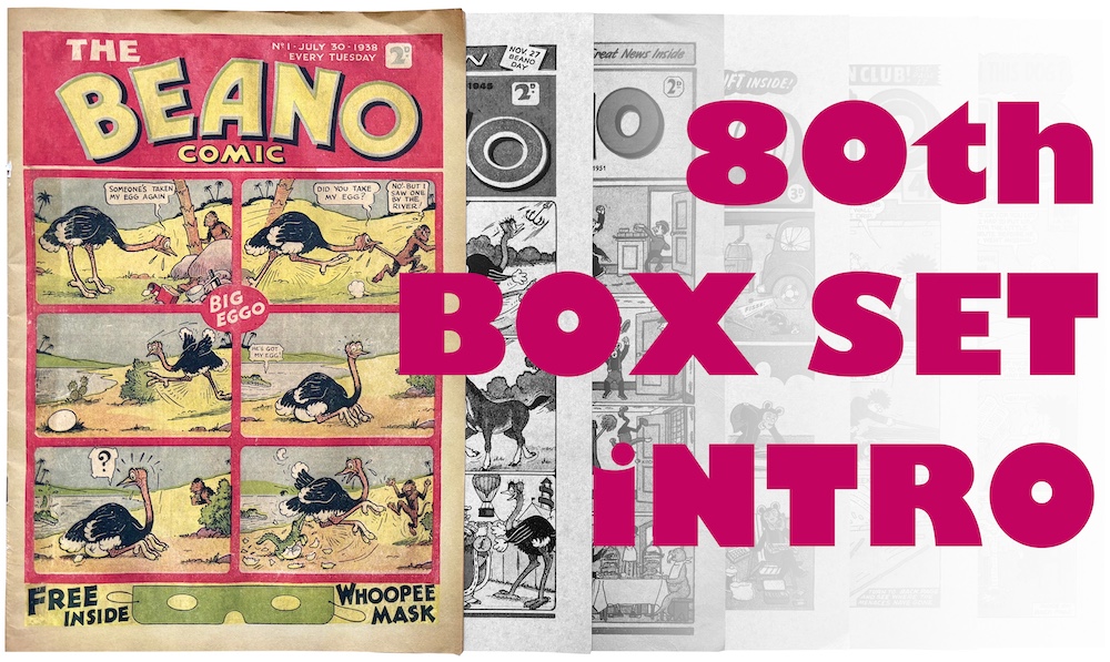 Released in 2018 to mark the 80th anniversary of Beano, this wonderful box set of eight comics, a huge poster, Dennis and Gnasher fan club pack and other extras deserves more than just a simple write up. Eight comics pulled from eight decades is too good an opportunity for the OiNK Blog. Not a real time read through (for obvious reasons), but a read through of the eight comics on their release dates nonetheless. This should be a wonderful addition to this Retrospectives section of the blog.
