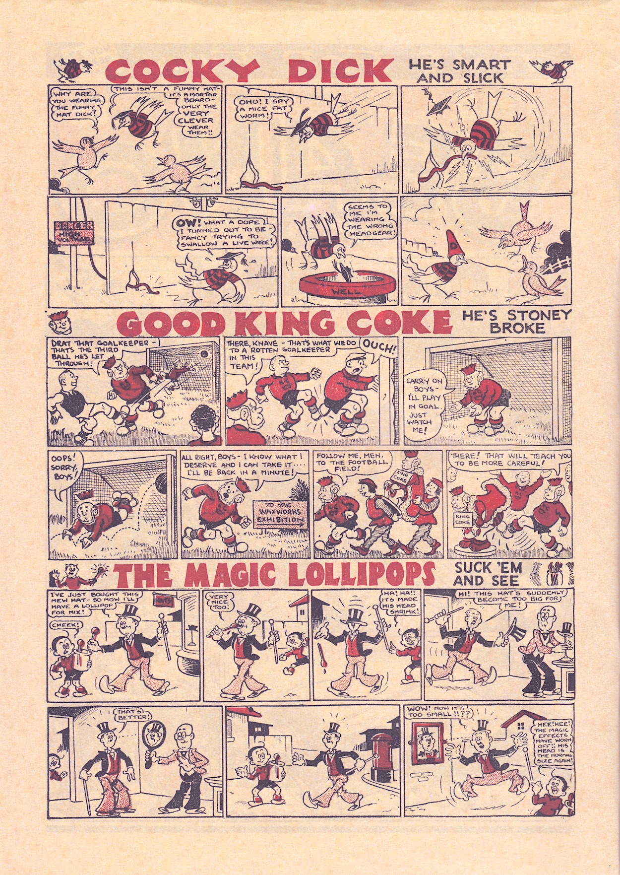 What a selection of names and taglines! Talk about being “of their time”. Researching Cocky Dick meant very careful internet searches but I did eventually find out it was originally drawn by Allan Morley and ran in the comic from 1939 to 1947. There’s an air of Dennis about the strip thanks to the cheeky nature of the main character and the colour scheme of his feathers. Nice of the local council to label their water wells too, otherwise how’d we know what it was.