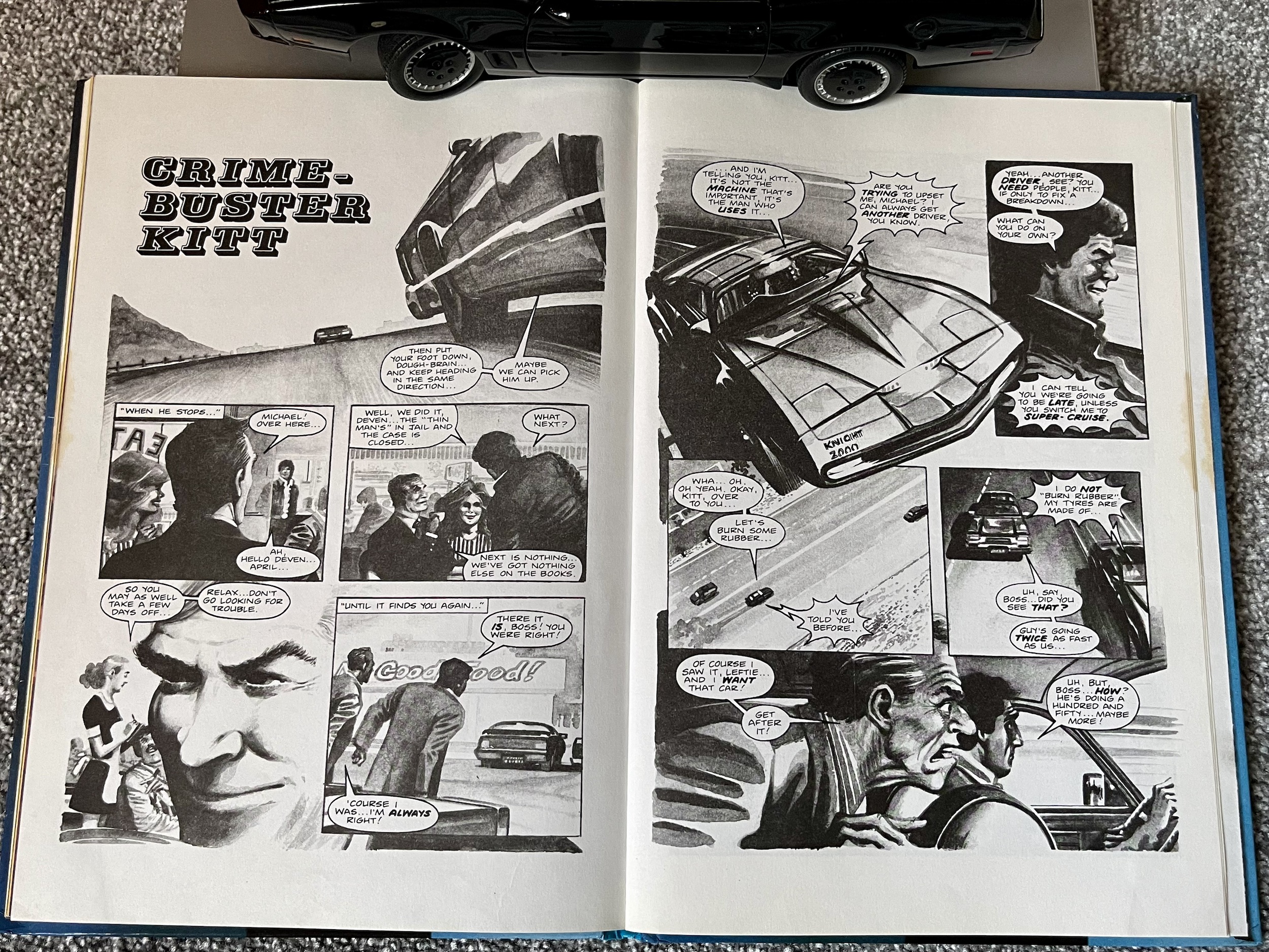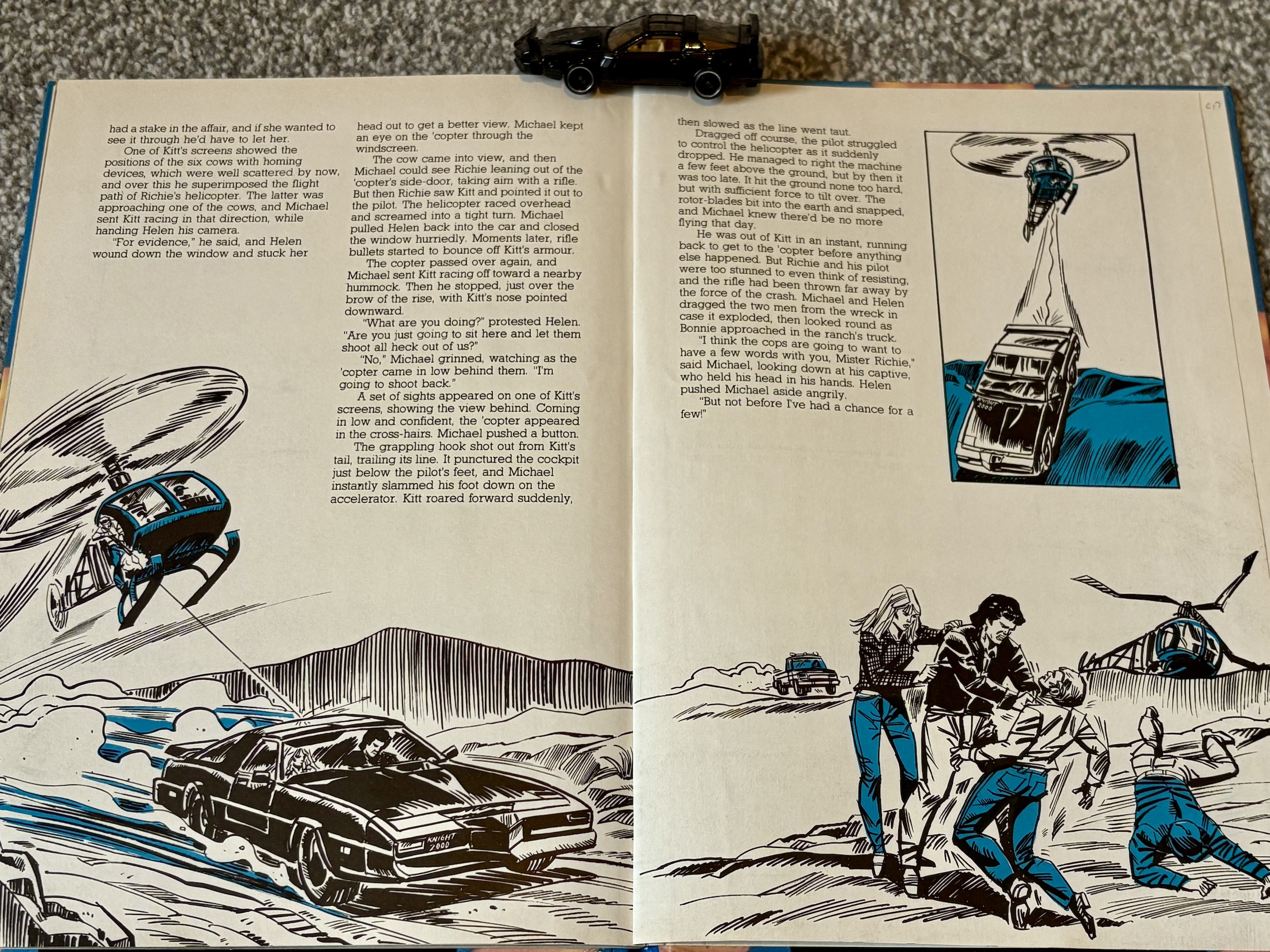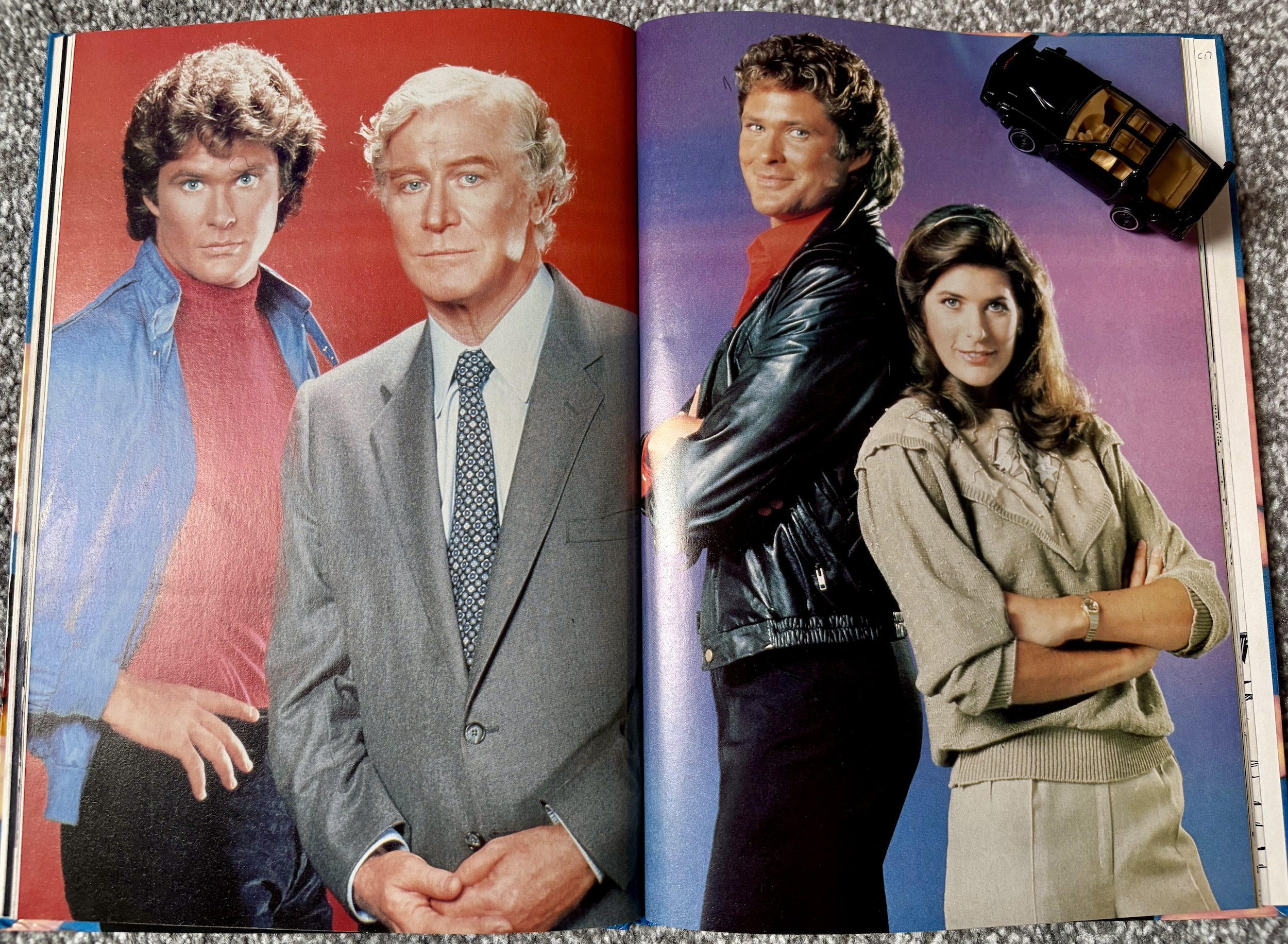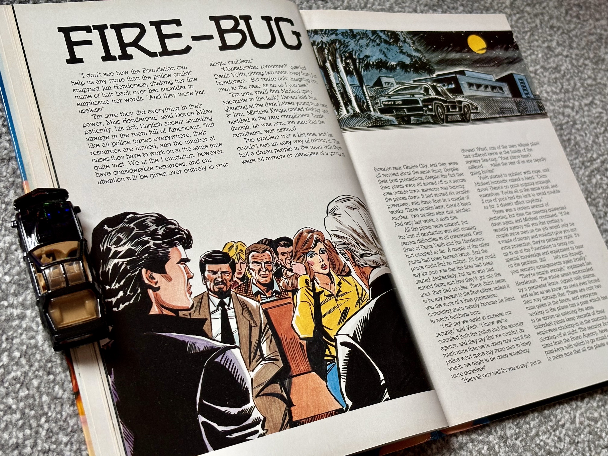 Here we have Michael (David Hasselhoff), Bonnie (Patricia McPherson) and Devon (Edward Mulhare) posing with the new convertible version of K.I.T.T., David alongside one of the computerised design images of K.I.T.T.’s new Super Pursuit Mode and on the inside back cover the full season four cast, including new addition Peter Parros as RCIII. Because no stories were written with the newest season (or apparently anything beyond the first season) in mind, this is the only time we see RC in the whole book!