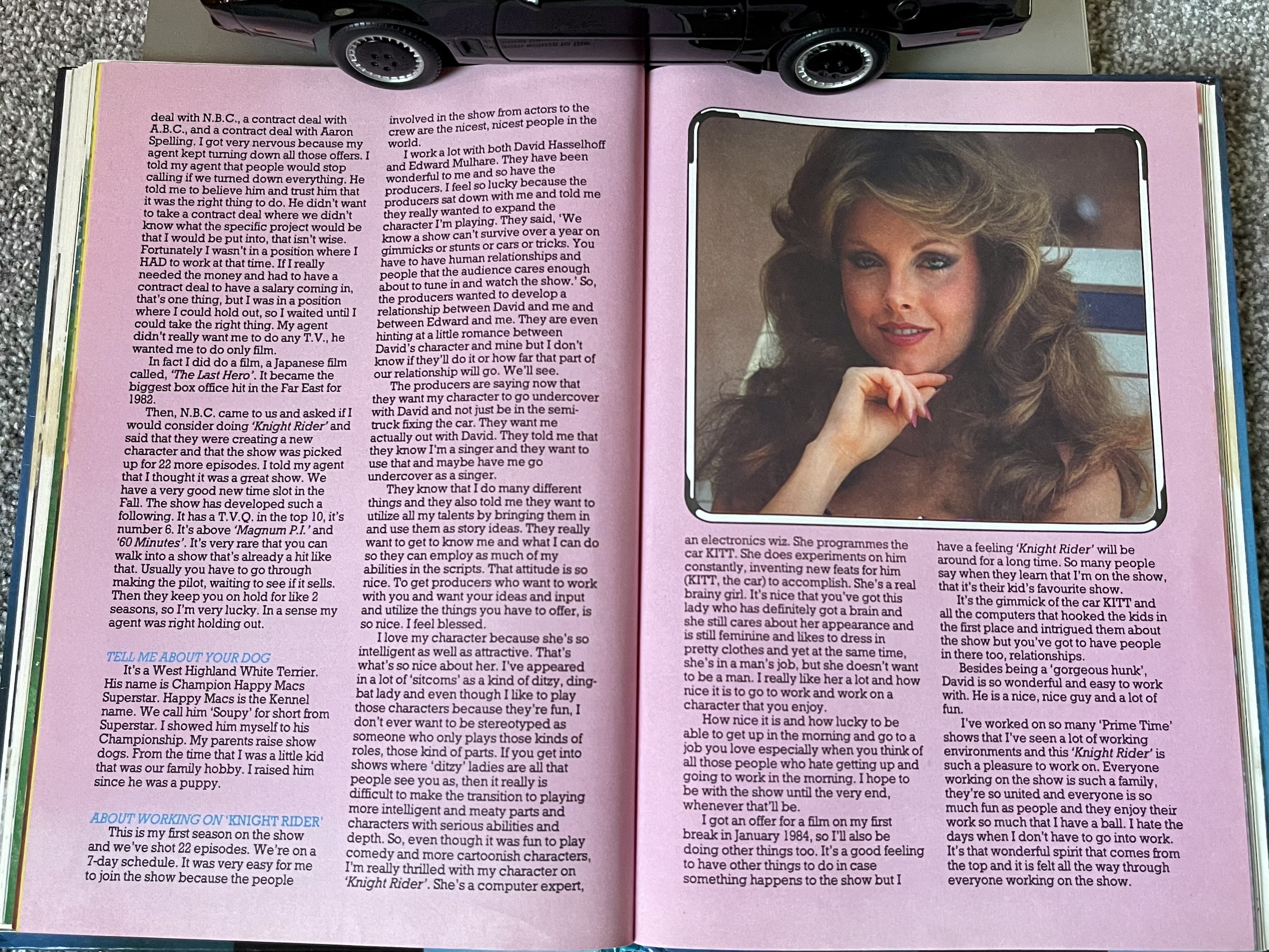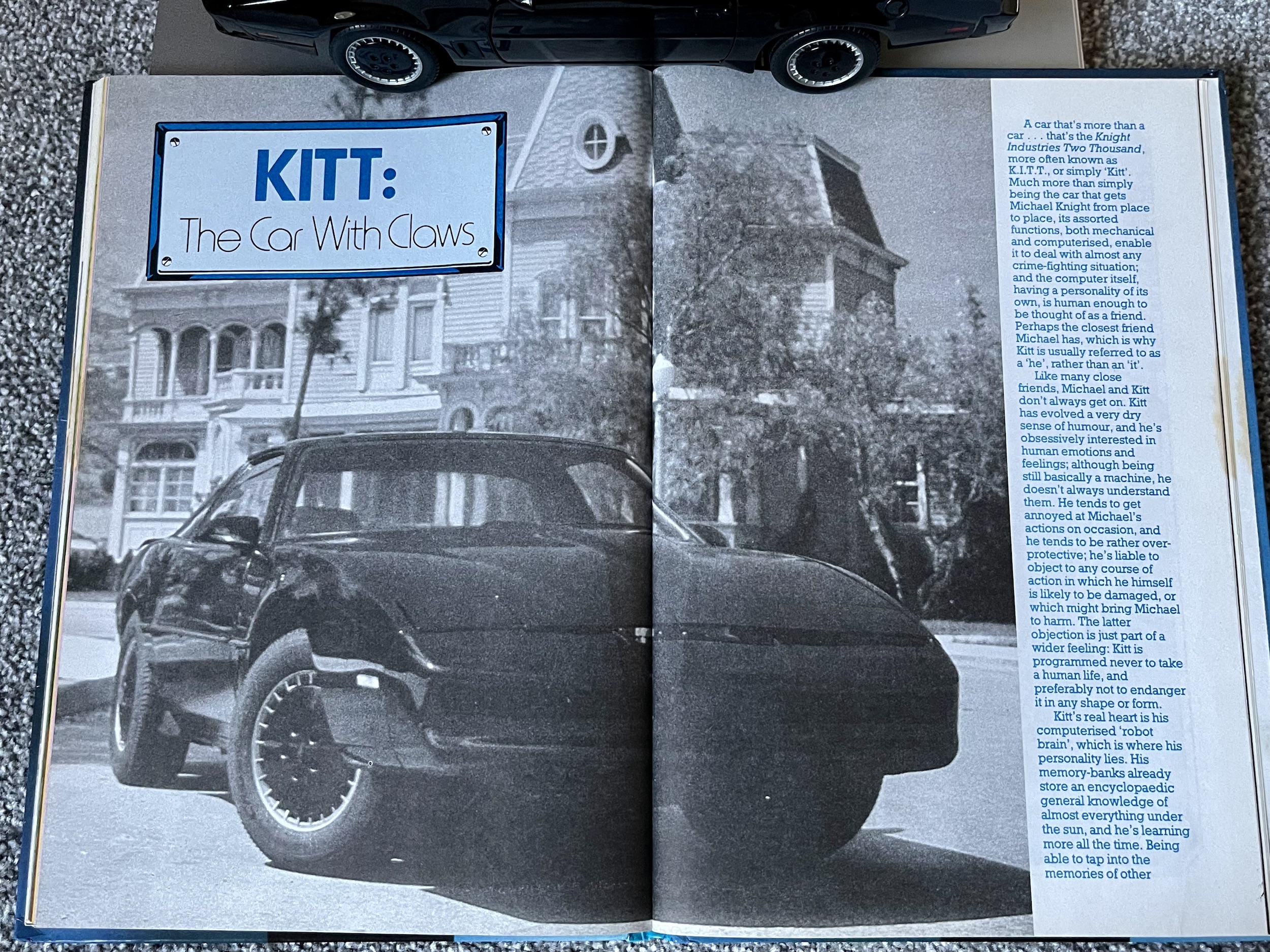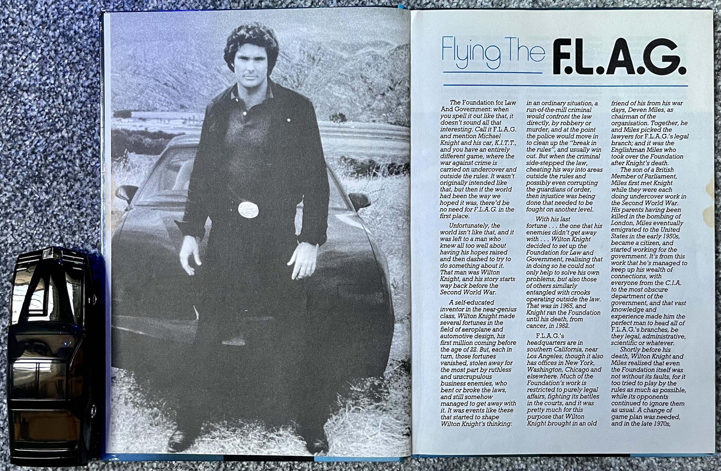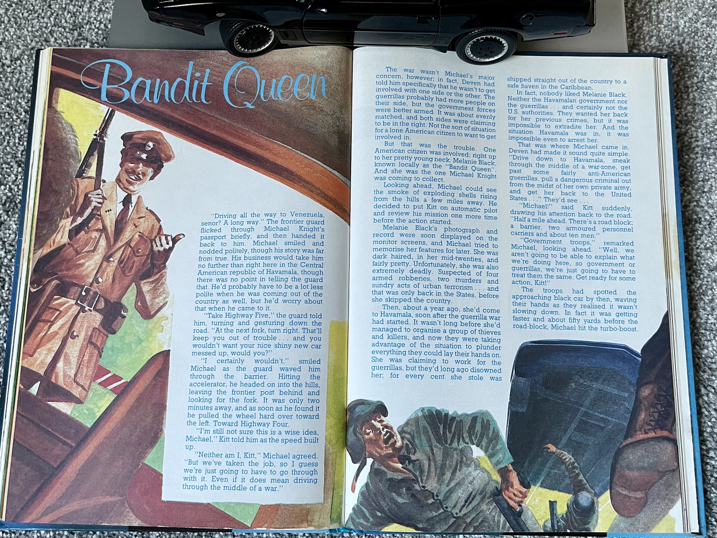 Here we have Michael (David Hasselhoff), Bonnie (Patricia McPherson) and Devon (Edward Mulhare) posing with the new convertible version of K.I.T.T., David alongside one of the computerised design images of K.I.T.T.’s new Super Pursuit Mode and on the inside back cover the full season four cast, including new addition Peter Parros as RCIII. Because no stories were written with the newest season (or apparently anything beyond the first season) in mind, this is the only time we see RC in the whole book!