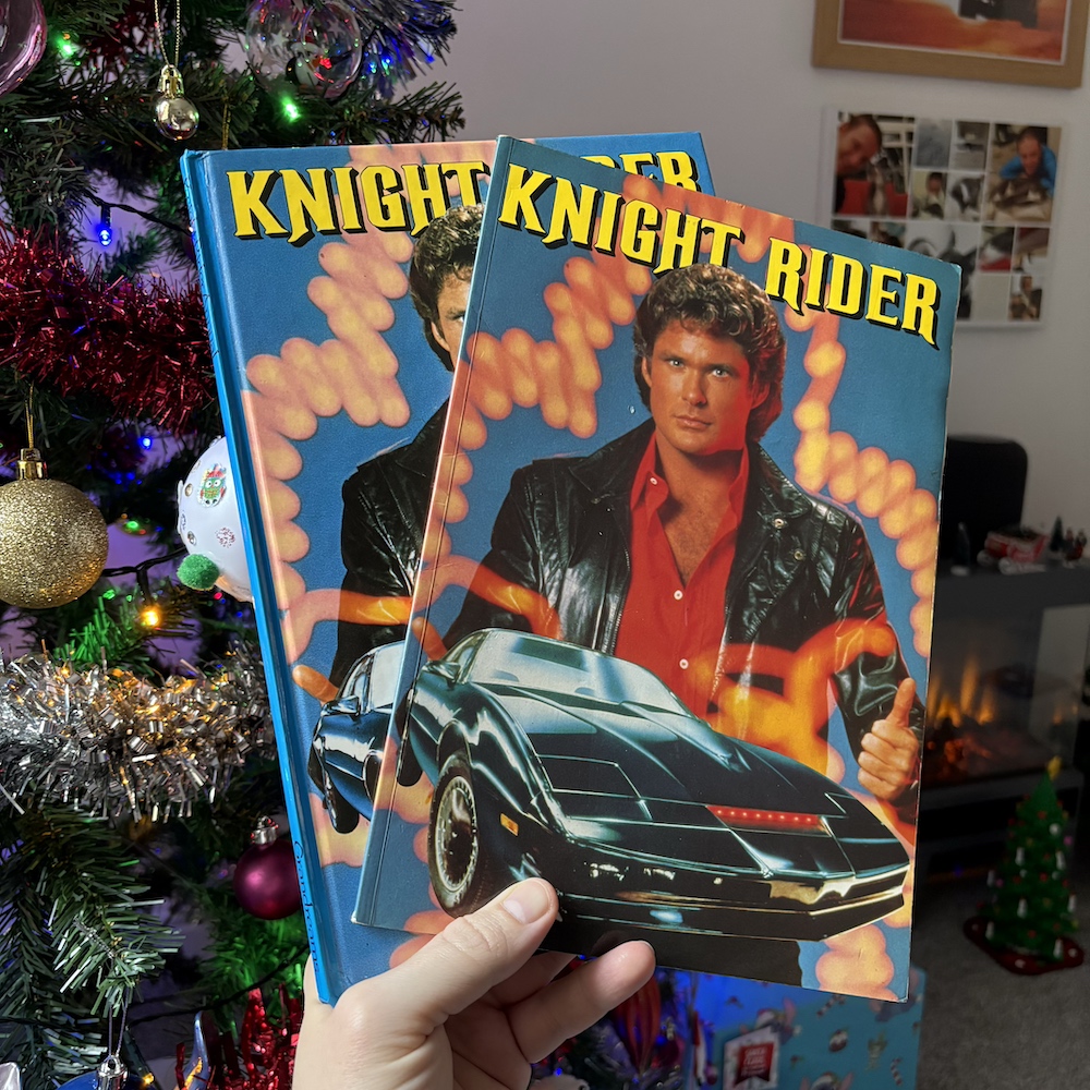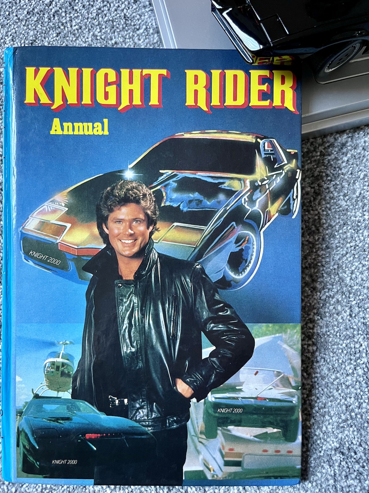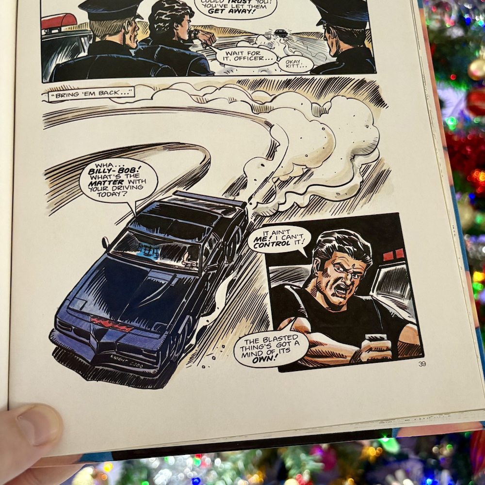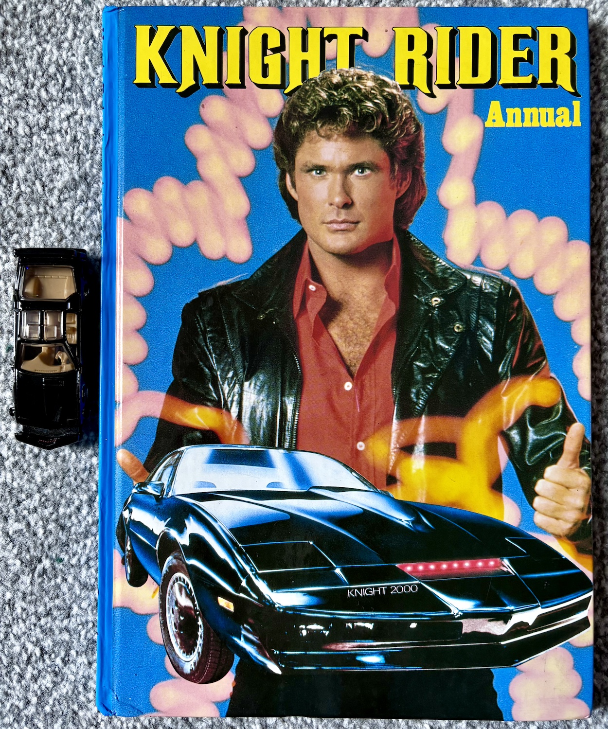 Okay, let’s deal with the elephant/panther in the room. No, I’ve no idea what the deal is with this cover. The copyright notice inside shows they used a promotional image for David Hasselhoff’s music rather than Knight Rider (with K.I.T.T. in his new season four Super Pursuit Mode copied and pasted over the top). But let’s not get hung up on that, it’s time for our fourth Knight Rider Annual from 1986. I’ve really looked forward to these every year, given how the show is My Favourite Thing in the Universe and the books have been fun so far. It’s the usual 64-page hardback from Grandreams with two comic strips and what first appears to be three text stories.
