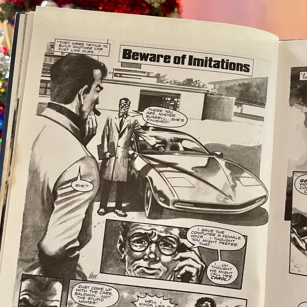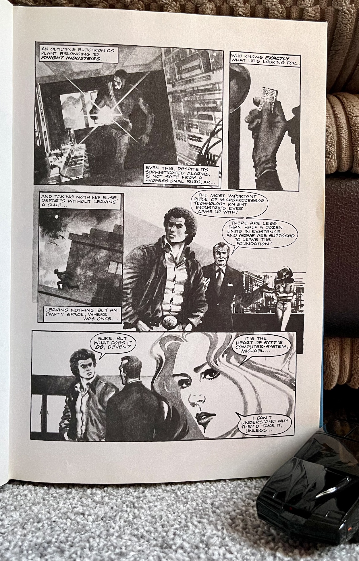 The first strip is called KITTnapped and given how an early season four episode was called KITTnap this kind of confirms the writer wasn’t watching the show they were writing about. It’s a silly story involving a disgruntled former F.L.A.G. (Foundation for Law and Government) employee who overrides K.I.T.T.’s systems far too easily to pull off a bank heist. He ends up captured because he’s too lazy to leave his house to park the car in his garage, instead using K.I.T.T.’s unique and easily traceable radio frequency to control it remotely.