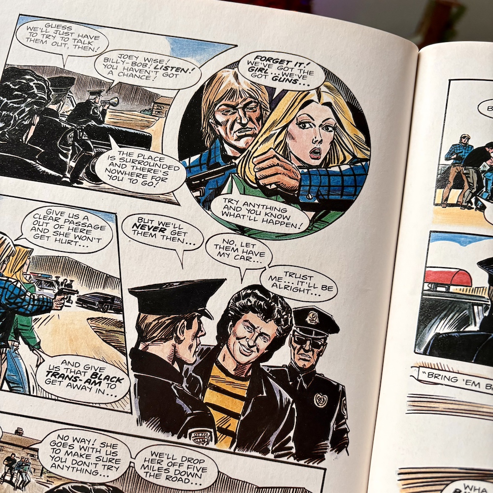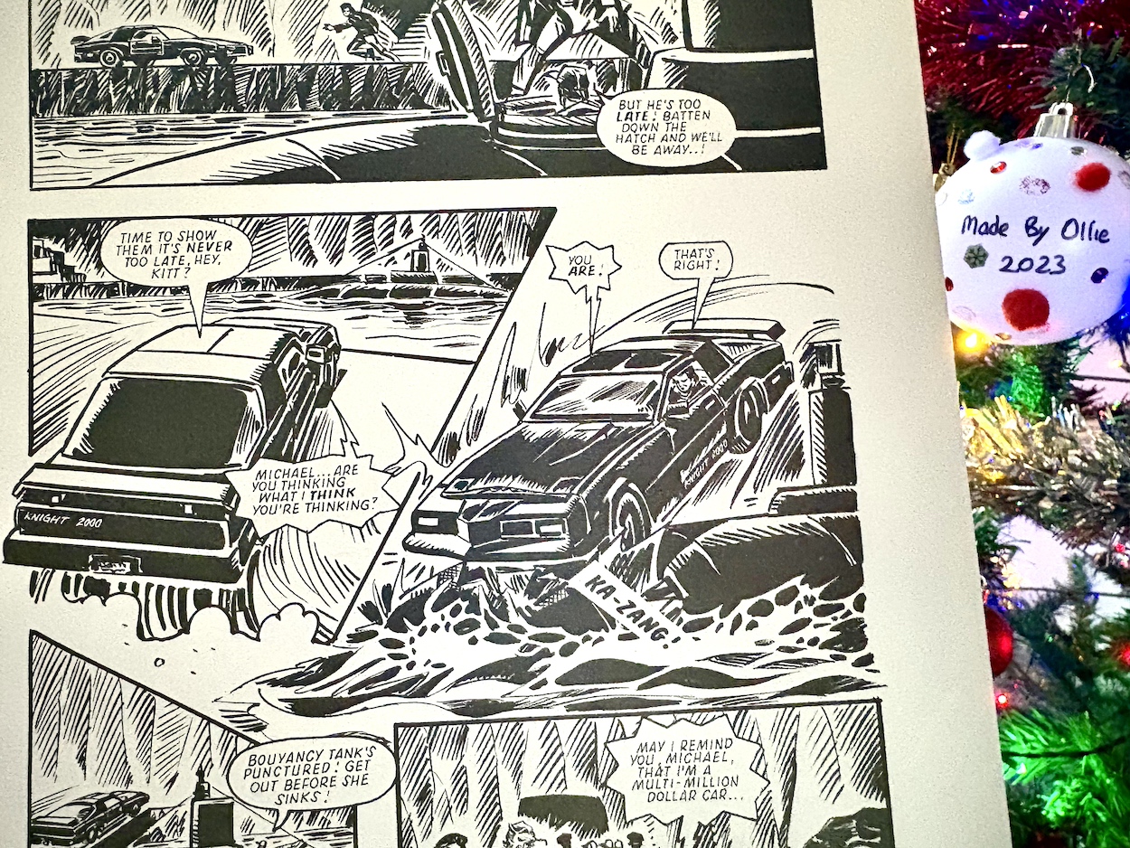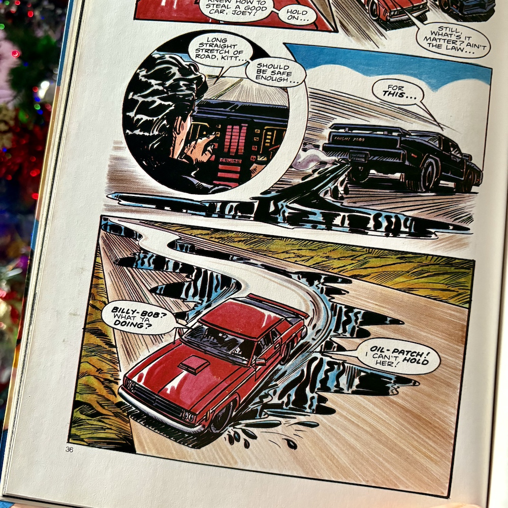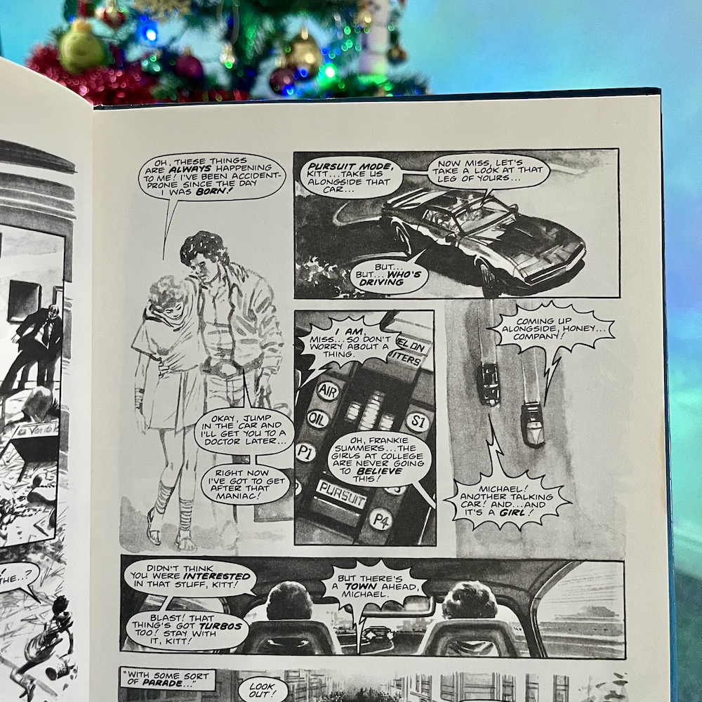 After being arrested and then freed by K.I.T.T. in a copycat scene from the original pilot movie they hide out under thick trees all night to spot the helicopter, which leads them to a jungle. The text tells of the struggles of trying to get the Trans-Am through the undergrowth but there’s no dialogue! We all know K.I.T.T. would’ve been hilarious throughout this. In the end they do something else the show just couldn’t have afforded. They find a river that’s just a little deeper than the car is tall and they drive down under the surface (unforgivably not illustrated) to a James Bond villain-esque hideout and find Mary beckoning Michael to a table outside the complex where she’s poured him a drink. Again, very Bond-like.