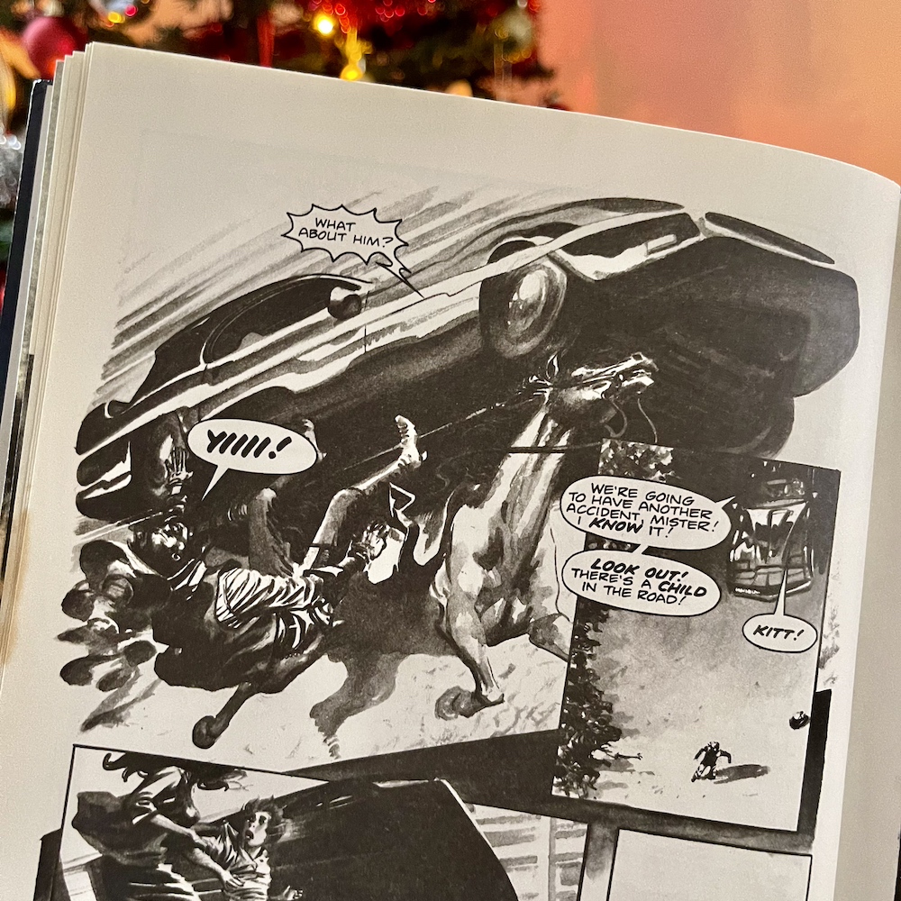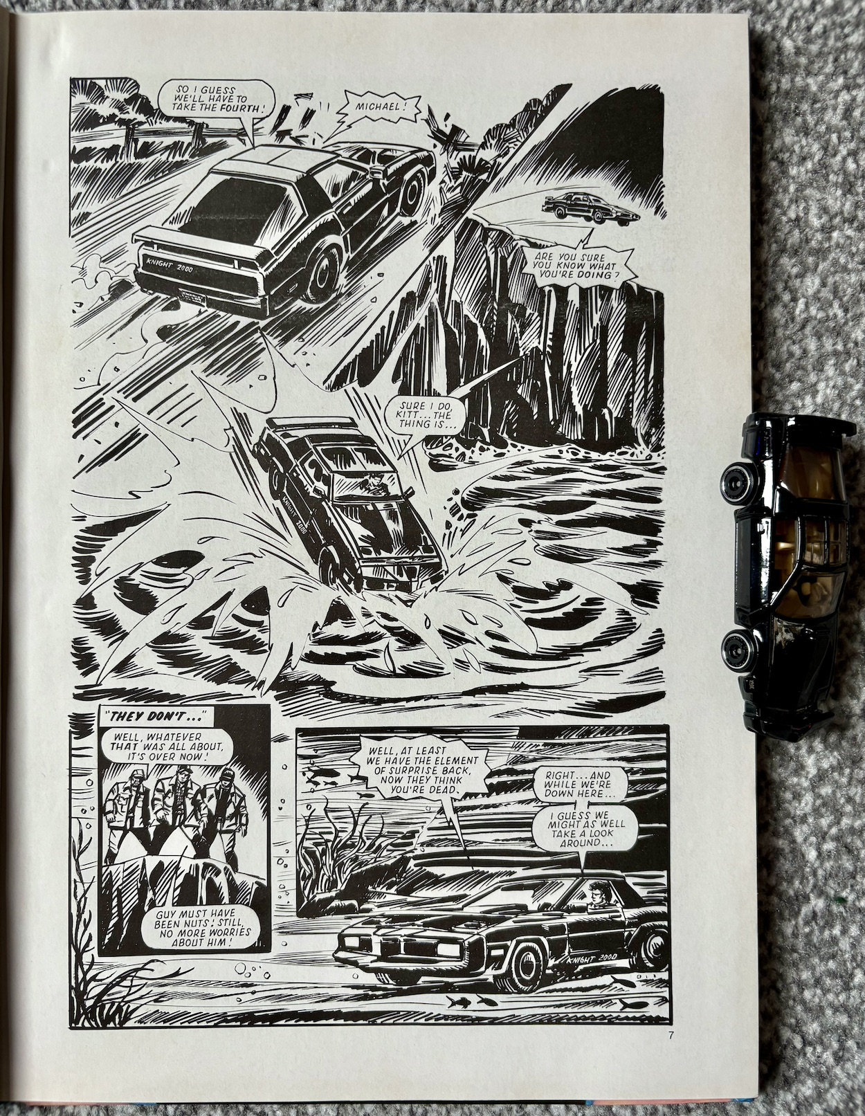 We finish off with another simple strip. In Rallying Cry the World Rally Champions are under investigation for cheating. Michael, (regular character and cyber technician) Bonnie Barstow and K.I.T.T. enter the race, with Devon telling them they’re not allowed to win (possibly a nice nod to them accidentally winning during such missions in the show). Once neck-and-neck with the lead car they’re run off the road and over a cliff. Of course the villains didn’t reckon on a Trans-Am capable of jumping back up again. Soon our heroes track them to where they’ve hidden their car and taken a helicopter to an identical car further along the race. Ridiculous, isn’t it?
