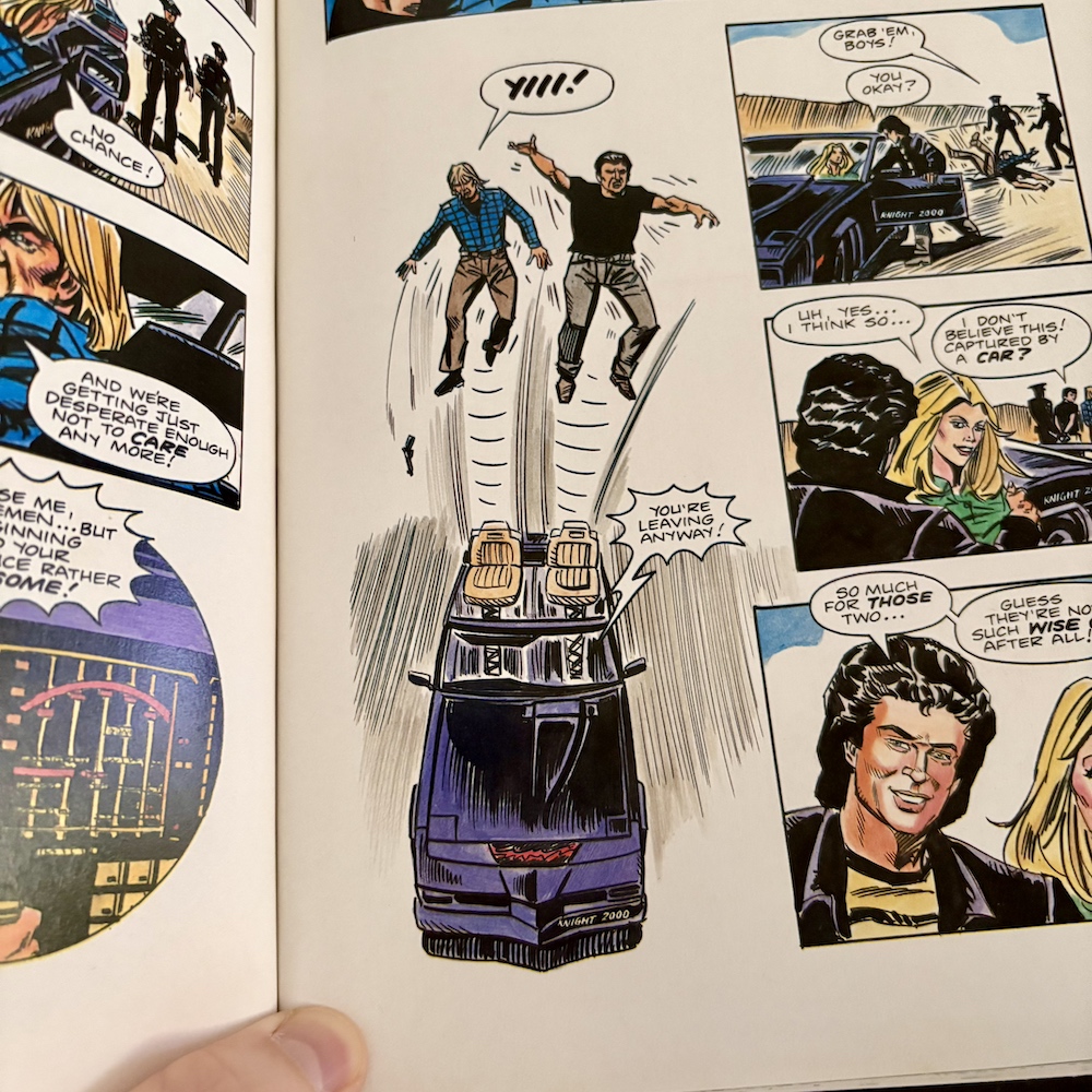 Michael, Bonnie and K.I.T.T. easily catch up with the helicopter and with all the proof recorded they just need to stop the men from winning again. The strip is really just an excuse to have K.I.T.T. use his most popular physical abilities, such as ski mode to drive on two wheels to overtake someone on a tight stretch of road, and of course the turbo boost! This is used to jump over the cheaters’ before K.I.T.T. comes to a dead stop, the other car crushing up against him. As a nine-year-old I’m sure I would’ve loved this.